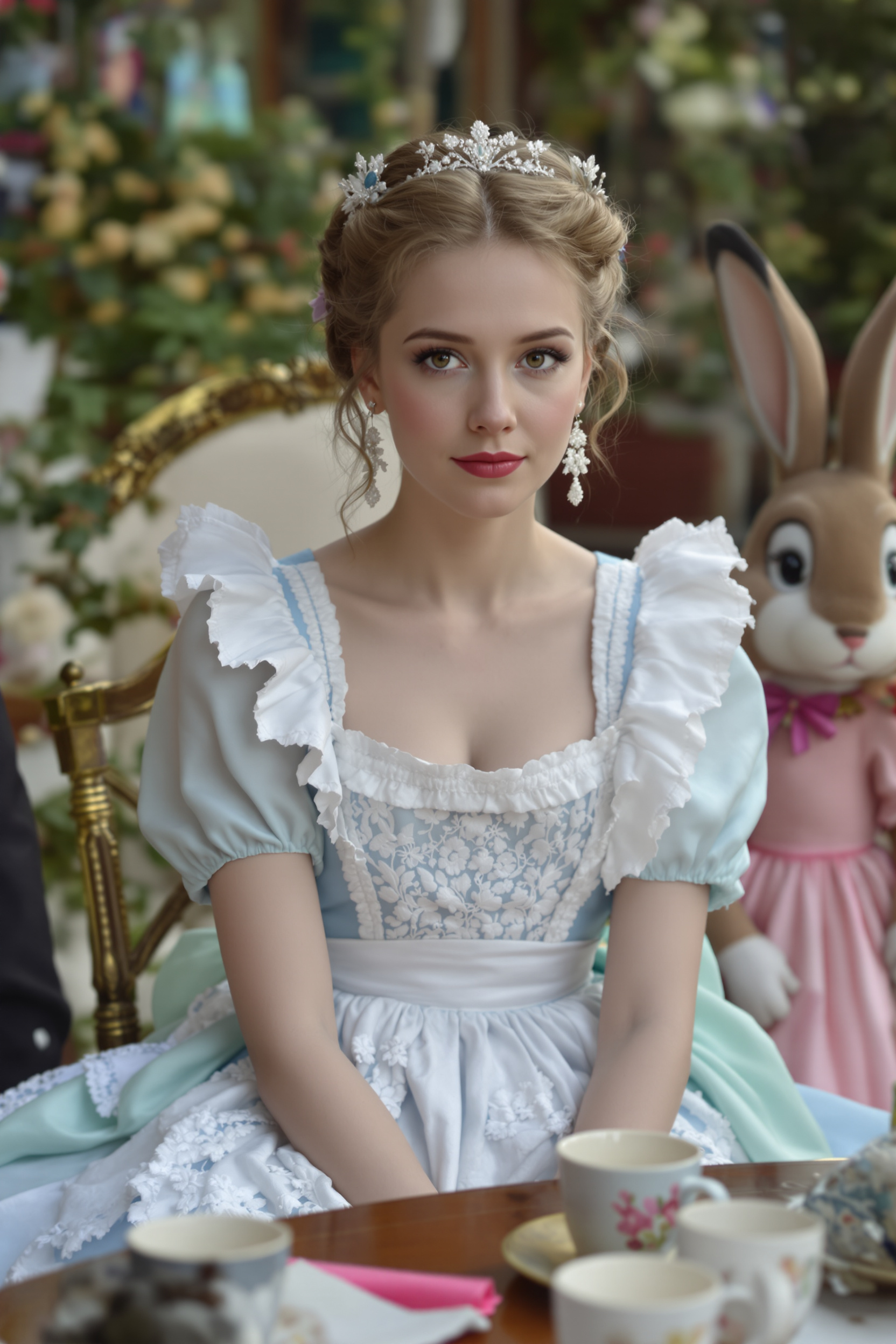 Женщина в небесно-голубом платье с белым кружевным передником, на плечах легкая мятная накидка, на столе рядом расставлены чашки, рядом с ней — задумчивый Шляпник и забавный Мартовский заяц, средний план, волшебная атмосфера, взгляд прямо в камеру.