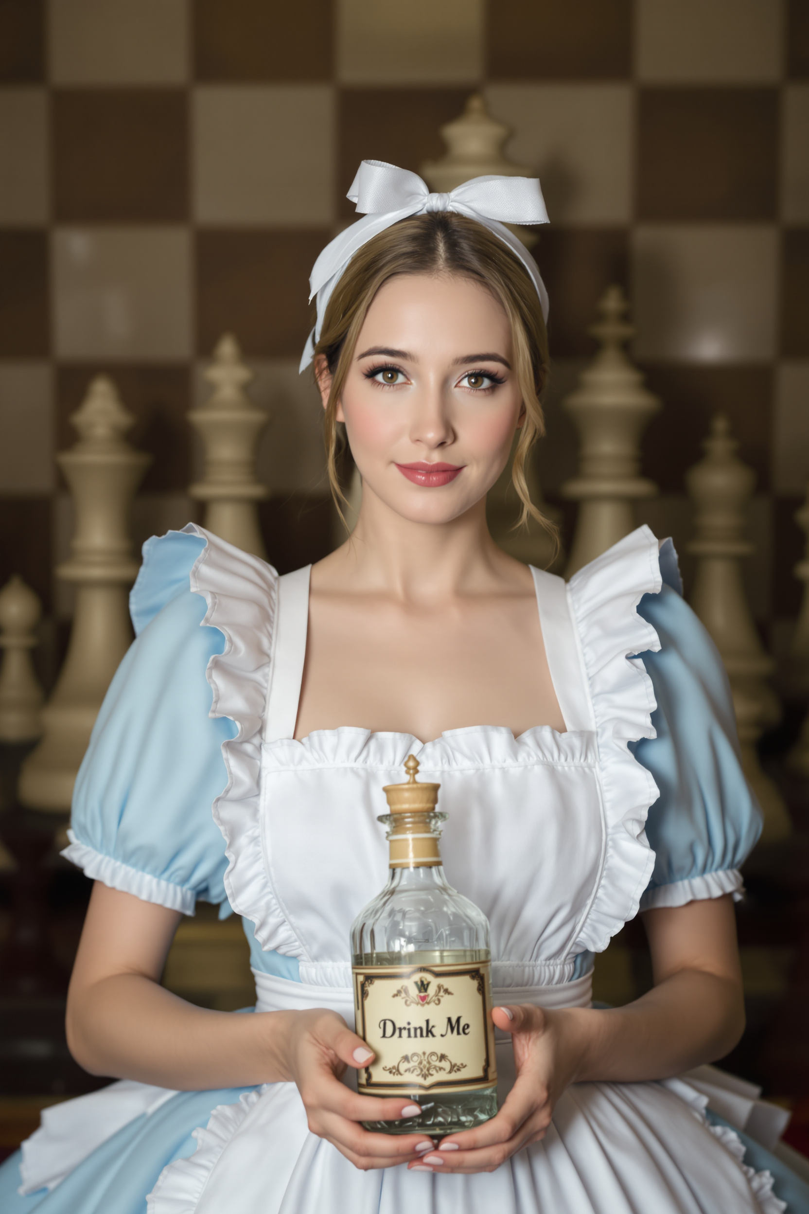 Женщина в небесно-голубом платье с оборками и тонким белым фартуком, на голове тонкая ленточка-бант, обеими руками держит декоративную стеклянную бутылочку с надписью «Выпей меня», позади огромные шахматные фигуры, средний план, взгляд уверенно в камеру.