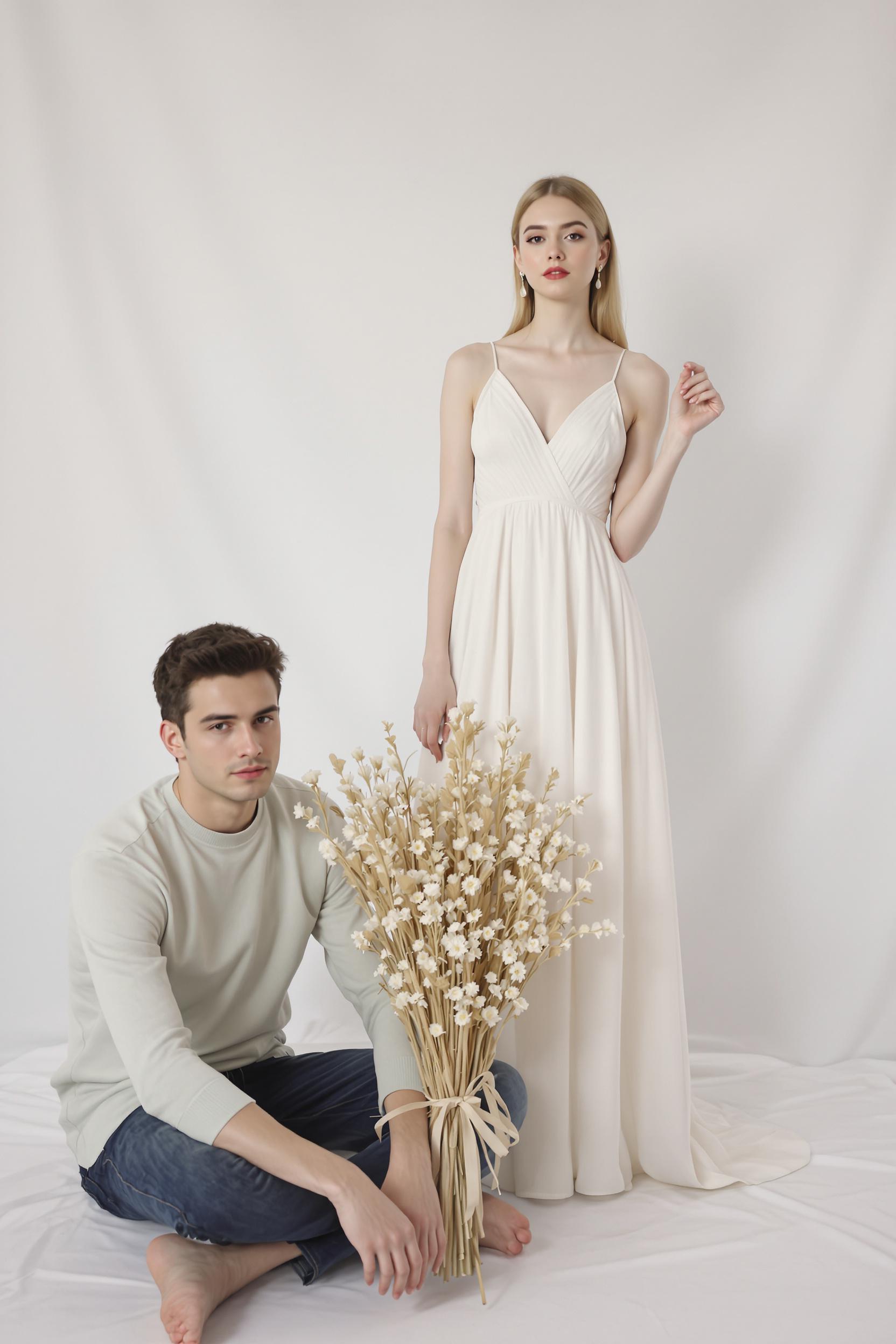 Женщина в нежном светлом платье стоит на фоне белой циклорамы, смотрит прямо в камеру с уверенным и спокойным взглядом. Рядом парень сидит на полу, он держит в руках аккуратный букет сухоцветов. Минимализм, средний план, акцент на её женственности.