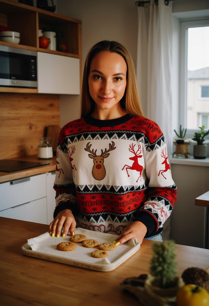 Женщина в новогоднем свитере с оленями стоит на кухне, украшенной для Рождества, держит противень с печеньем, смотрит прямо в камеру