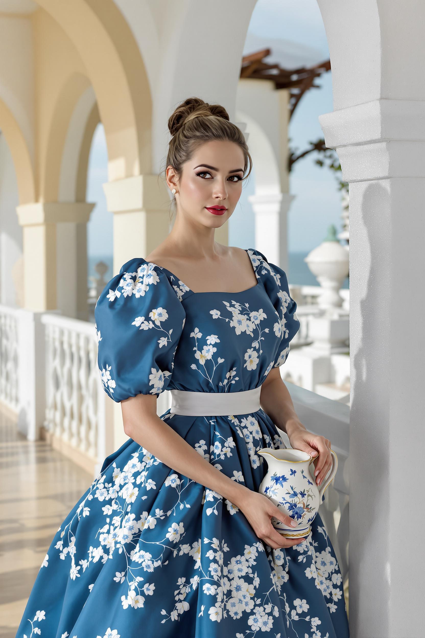 Женщина в объемном голубом платье с белым поясом стоит средним планом у белых перил, держит в руках расписной фарфоровый кувшин с белыми и голубыми цветами, смотрит в камеру, волосы собраны в гладкий пучок, поза расслабленная, фон — арки и морской пейзаж.