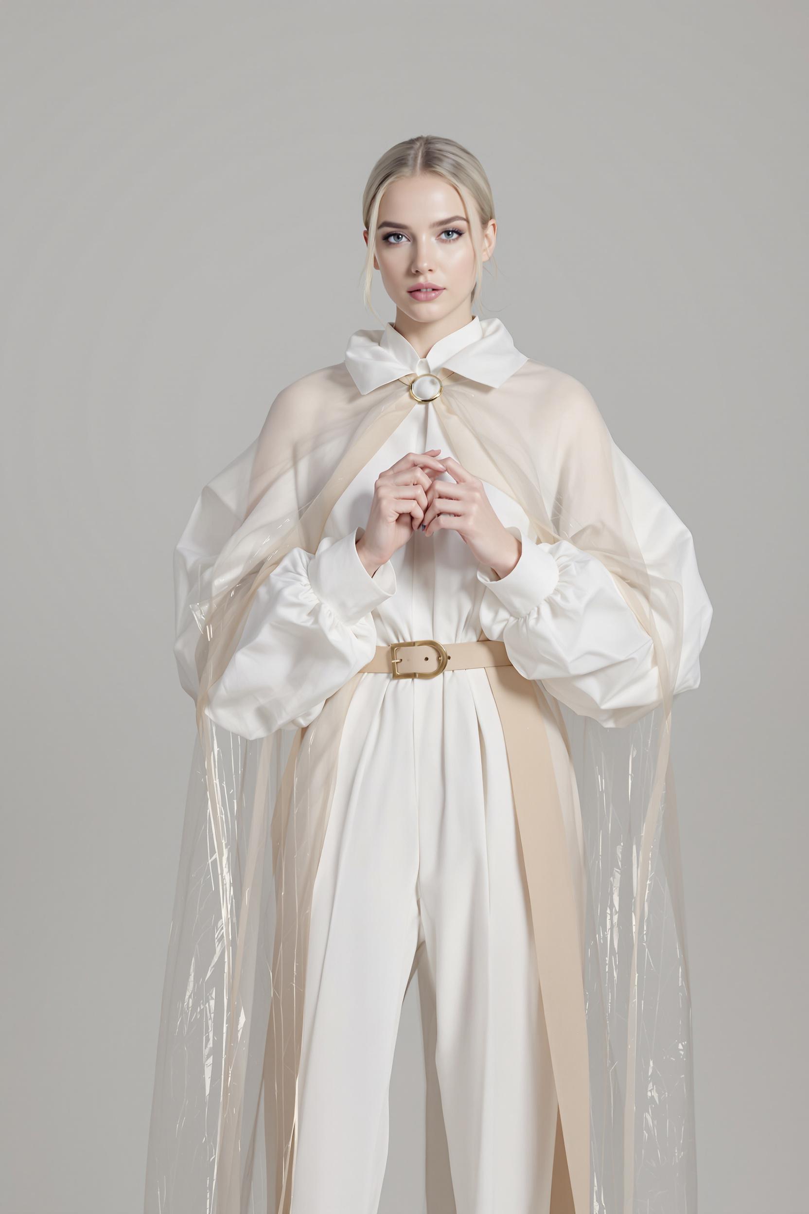 Женщина в объемной белой рубашке с удлиненными манжетами и узким кожаным поясом, на плечах длинный прозрачный плащ. Стоит вполоборота, локти разведены в стороны, кончики пальцев касаются друг друга на уровне груди, смотрит прямо в камеру. Фон — серый минимализм.