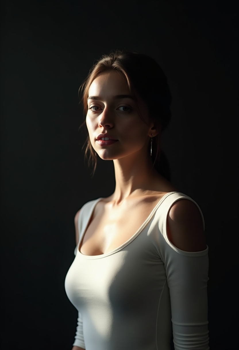 Женщина в облегающем белом топе с открытыми плечами стоит в абсолютной темноте, её лицо и верхняя часть тела подсвечены холодным направленным лучом сбоку. Свет резко выделяет её черты, оставляя тени на второй половине лица. Освещение резкое, подчёркивающее контраст.
