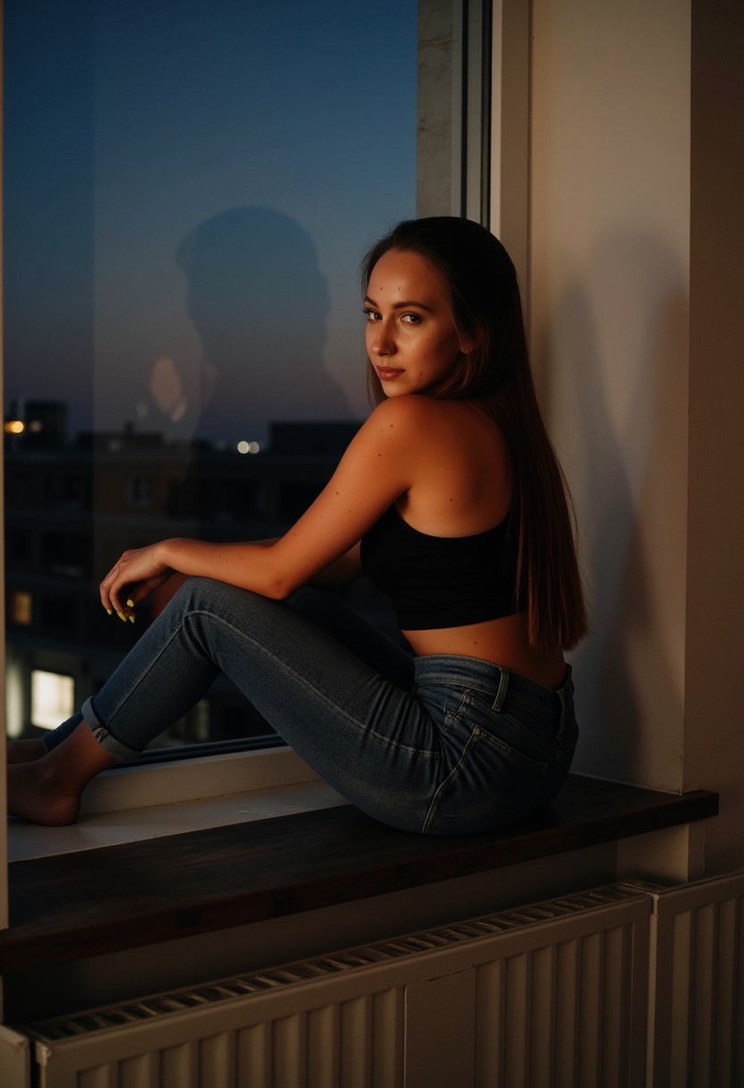 Женщина в облегающем топе и джинсах сидит на подоконнике с видом на ночной город, её ноги слегка согнуты, а взгляд уверен и загадочен.