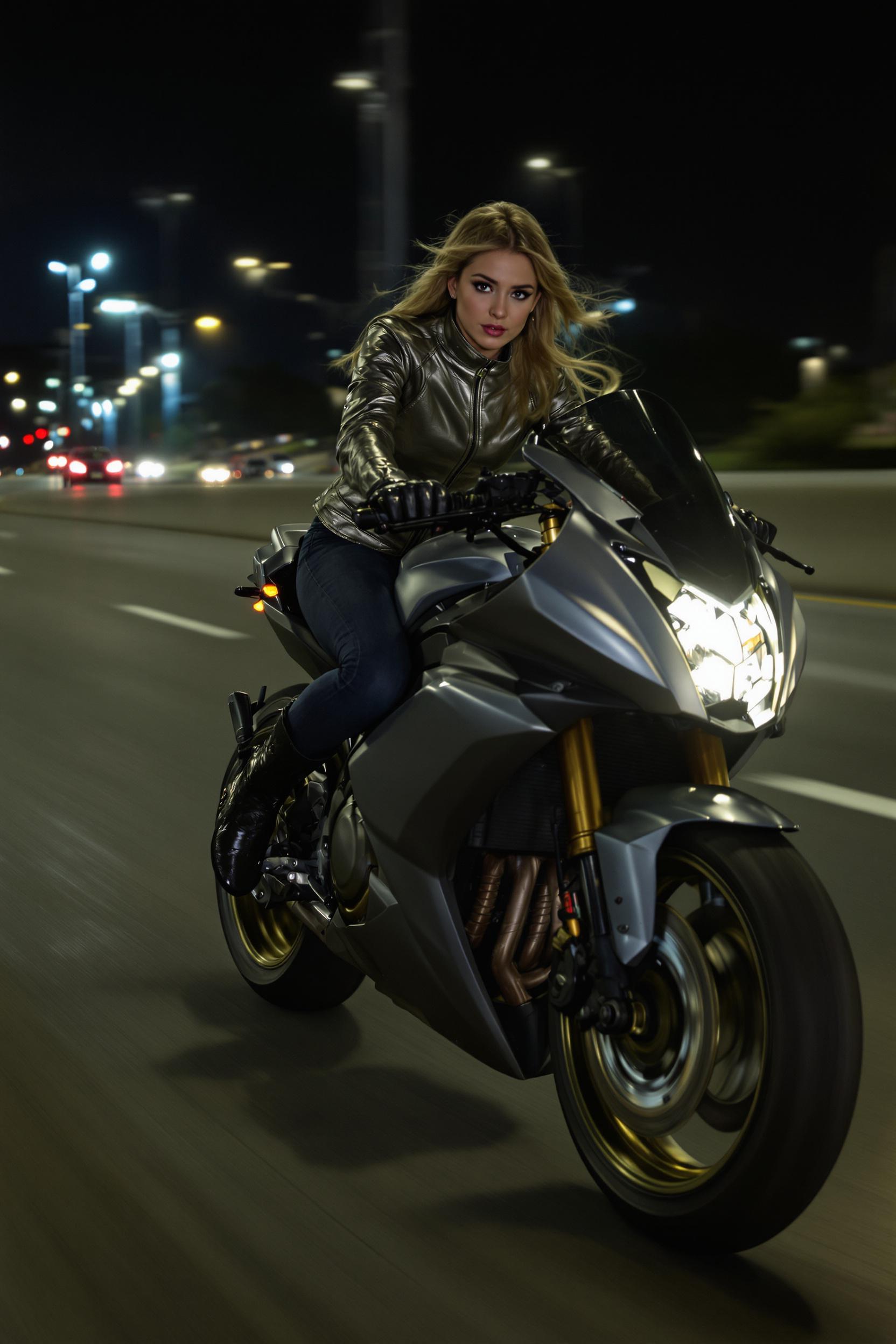 Женщина в облегающей серебристой куртке из экокожи, тёмных джинсах и высоких моторных ботинках мчится на спортивном байке по ночному шоссе среди огней города. Взгляд направлен прямо в камеру, средний план, динамика и блики от фар.