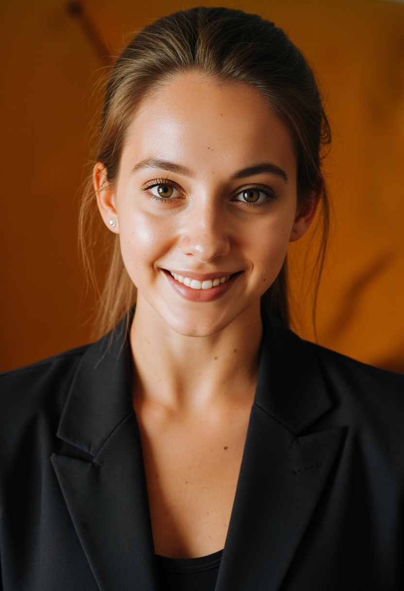 Женщина в официальной одежде с мягкой улыбкой, на фоне с лёгким тёплым светом, прямо смотрит в камеру
