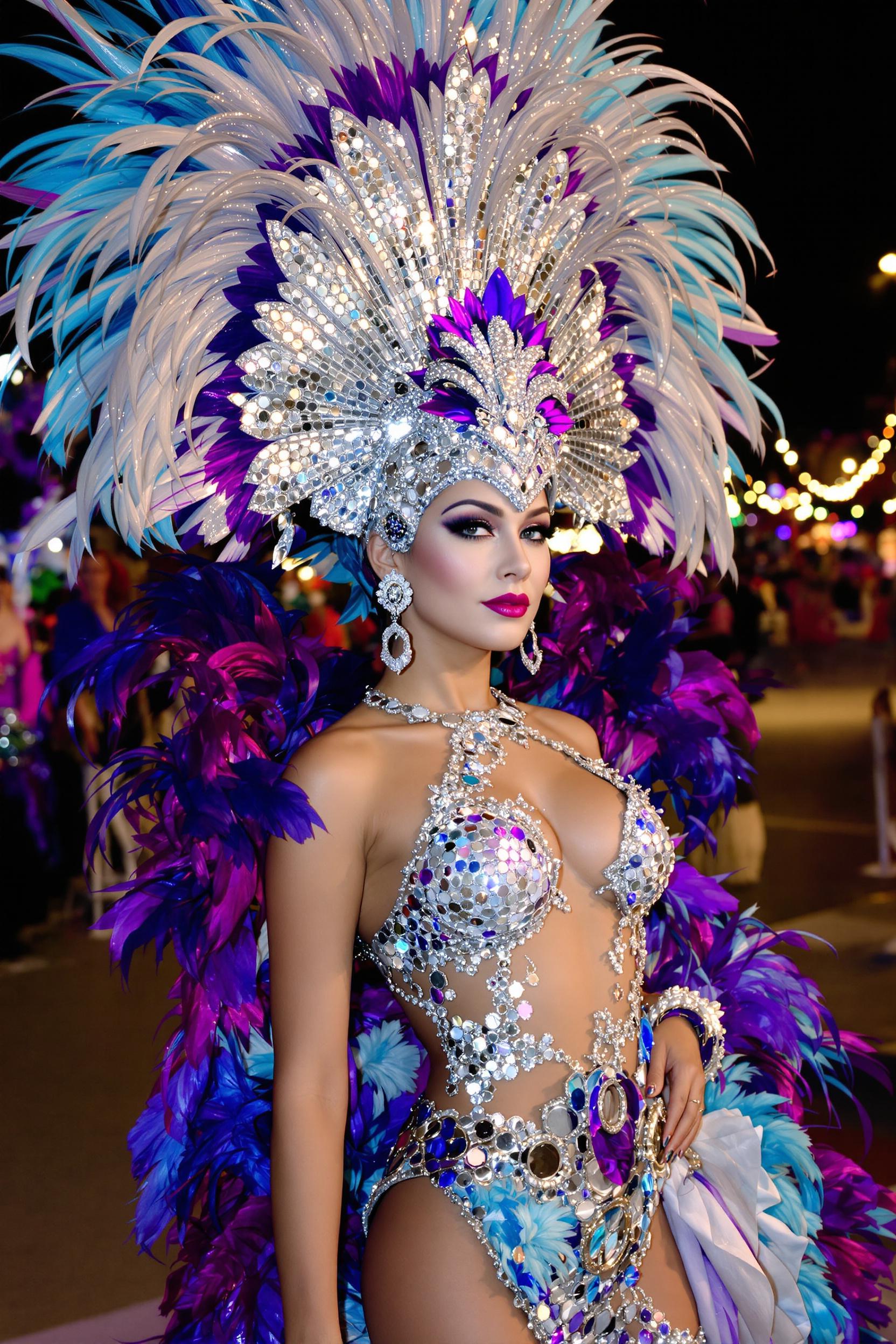 Женщина в оригинальном карнавальном костюме в стиле Рио: серебристый топ, украшенный яркими акриловыми зеркалами, легкая асимметричная юбка из синих и фиолетовых перьев, металлический пояс с крупными кольцами, массивный головной убор-веер, средний план, взгляд в камеру, фон — сияющие огни ночного карнавала.
