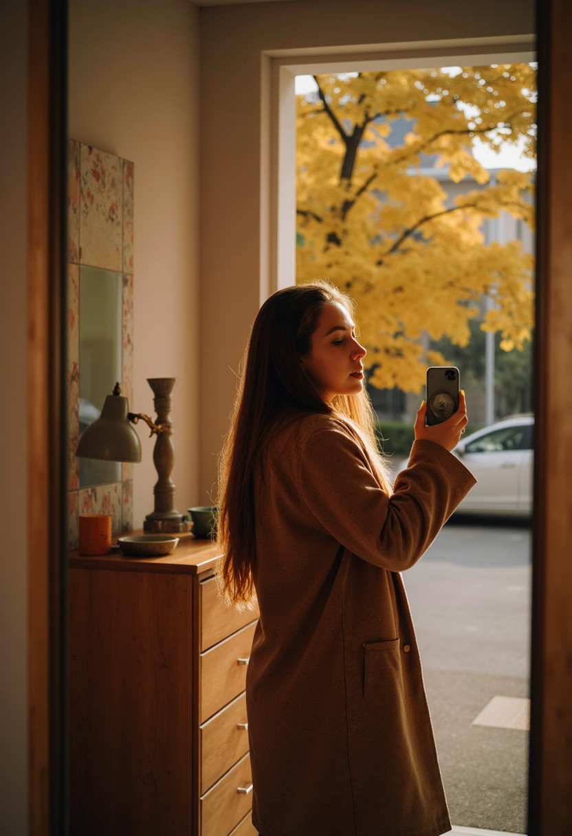 Женщина в осеннем пальто делает селфи в зеркале подъезда, за ней видны плиточные стены и осенний свет за стеклом