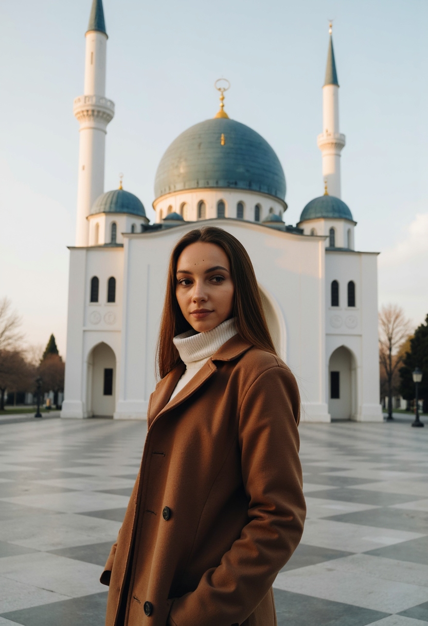 Женщина в пальто стоит на фоне мечети Кул-Шариф с её белоснежными стенами и голубыми куполами, смотрит прямо в камеру