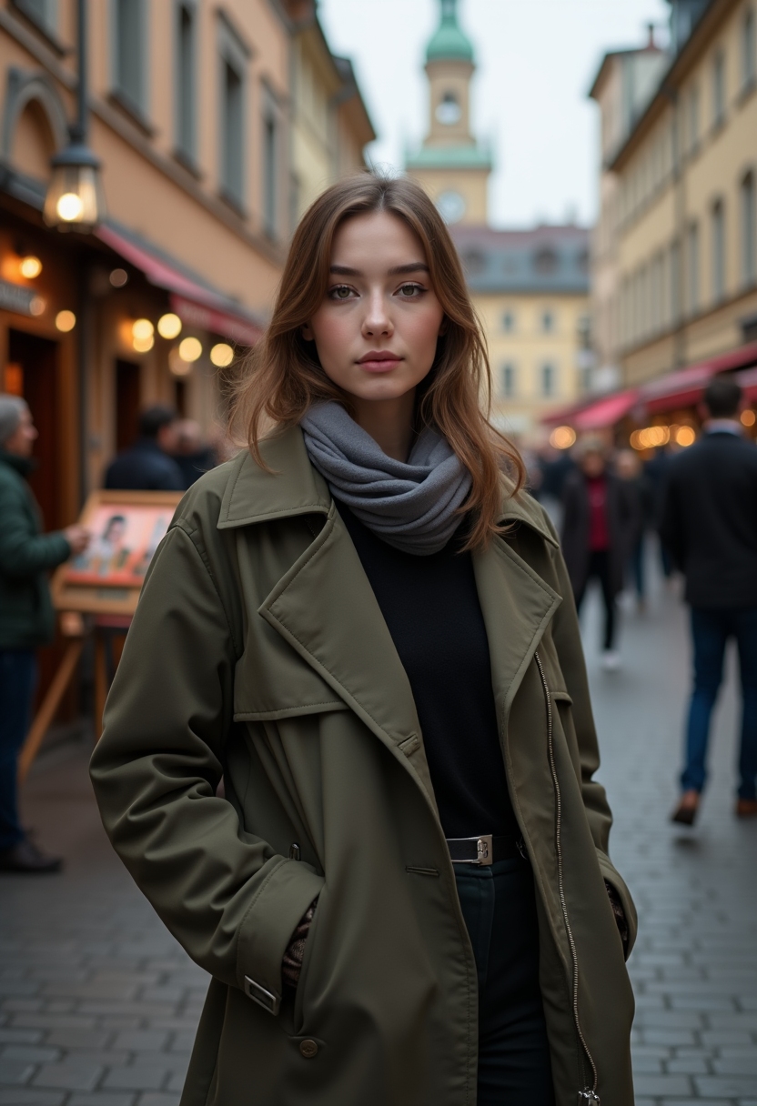 Примерить образ на себеЖенщина в пальто стоит на фоне уличных художников, рисующих портреты, смотрит прямо в камеру, вокруг старинные здания Арбата