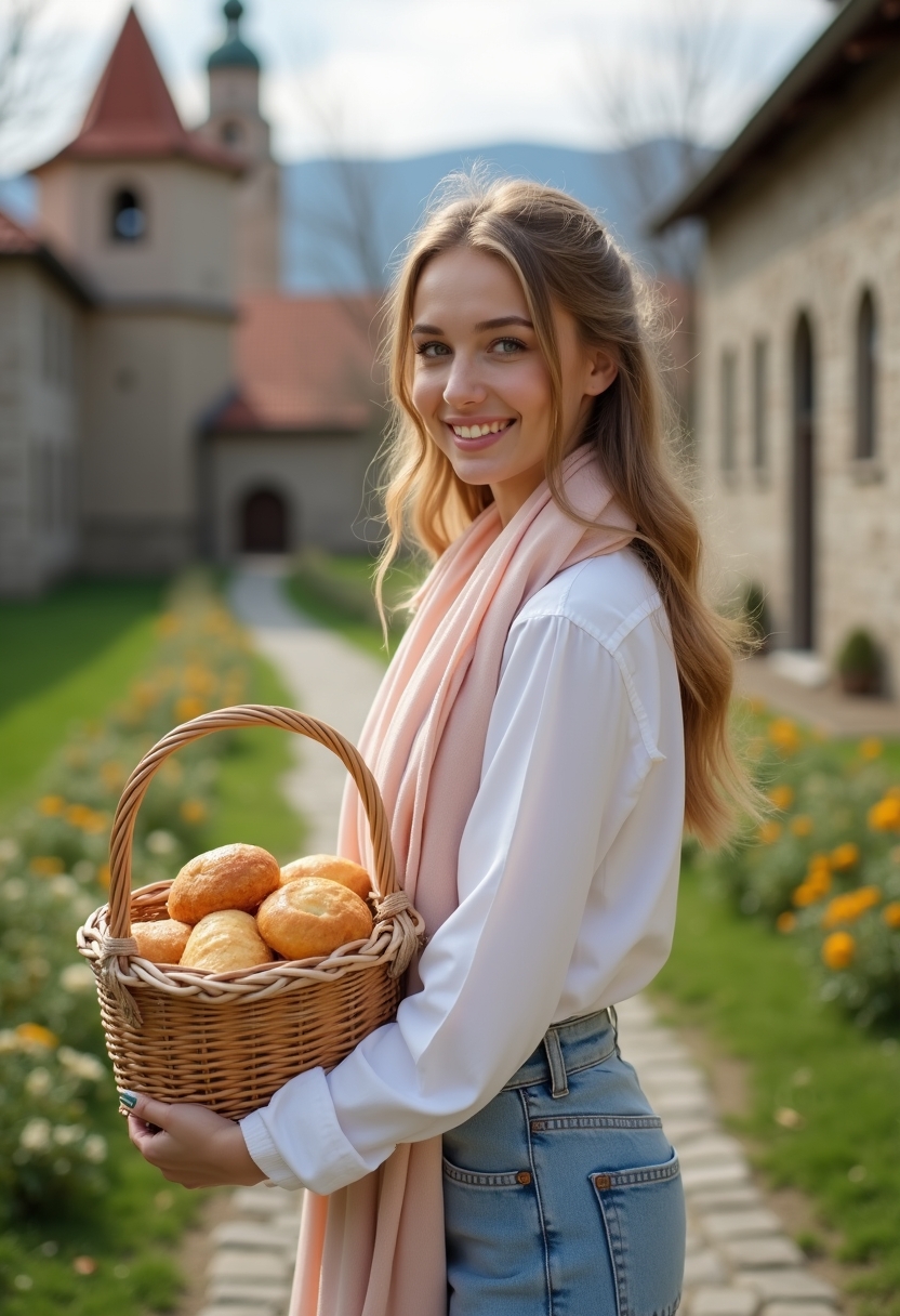 Женщина в пастельном платье и светлом платке идёт по дорожке в монастырском саду, в руках у неё корзина с освящённой пасхальной выпечкой. Она смотрит в камеру, её лицо светится радостью. Позади монастырские стены и звонница. Крупный план, акцент на духовности и чистоте праздника.