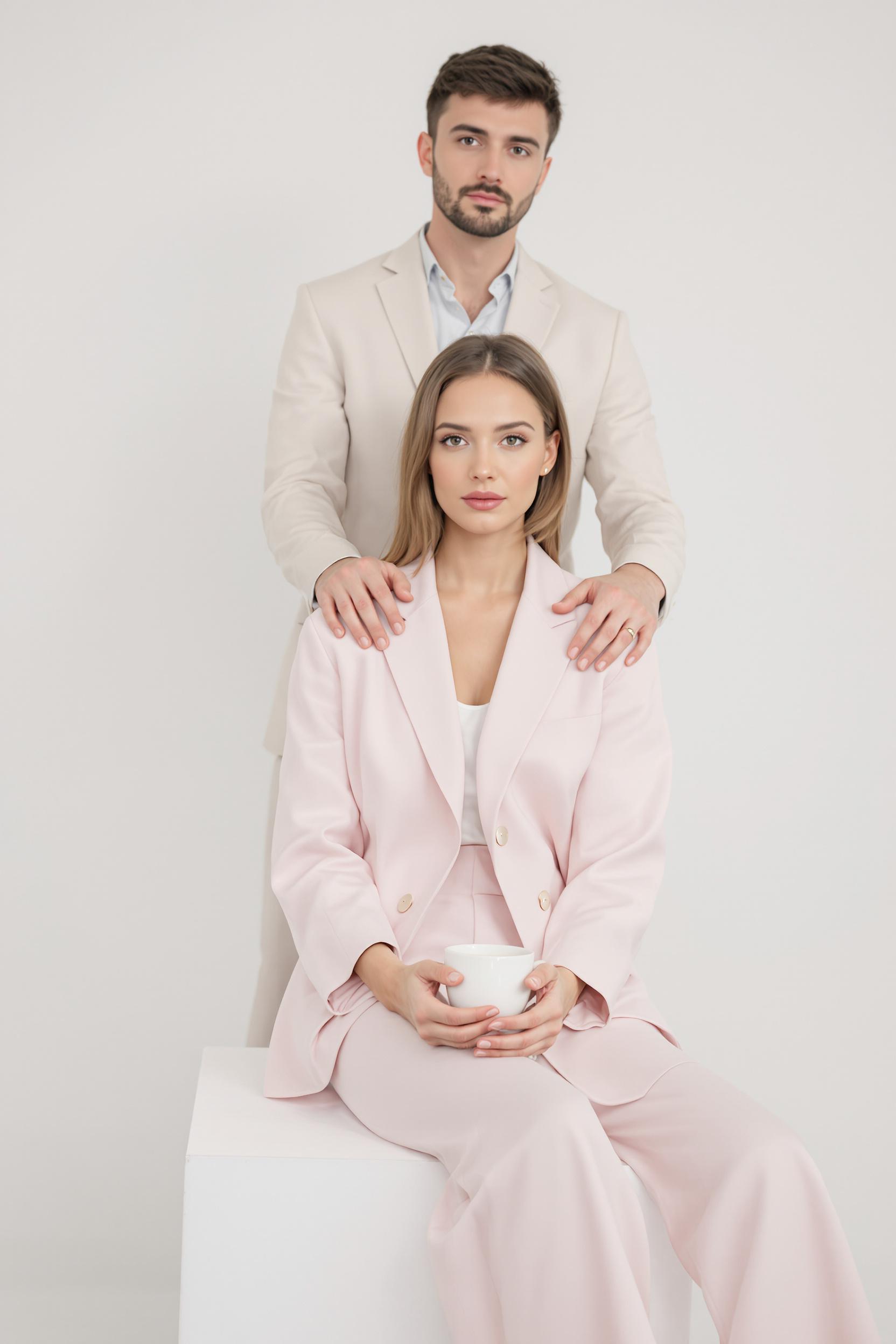 Женщина в пастельном свободном костюме сидит на низком кубе на белой циклораме, в руках у неё лаконичная керамическая чашка. Парень стоит позади, опустив ладонь ей на плечо, его лицо не видно. Она смотрит в камеру уверенно, минимализм, средний план.