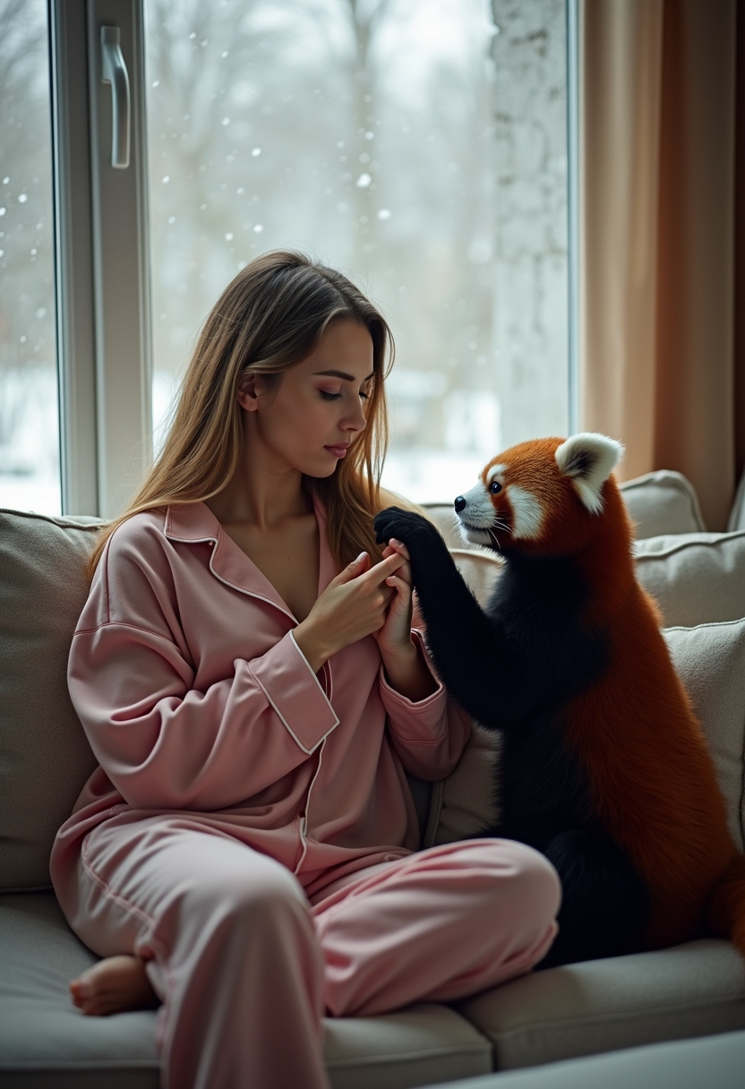Женщина в пижаме лежит на диване, а рядом красная панда нежно держит её руку лапкой, за окном виден снегопад.