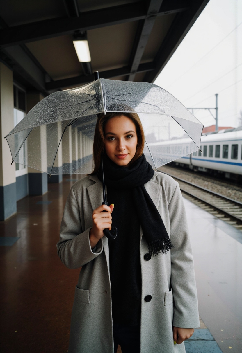Женщина в плаще и с зонтом стоит на фоне железнодорожного вокзала, вокруг мокрая мостовая. Фото в стиле Полароид