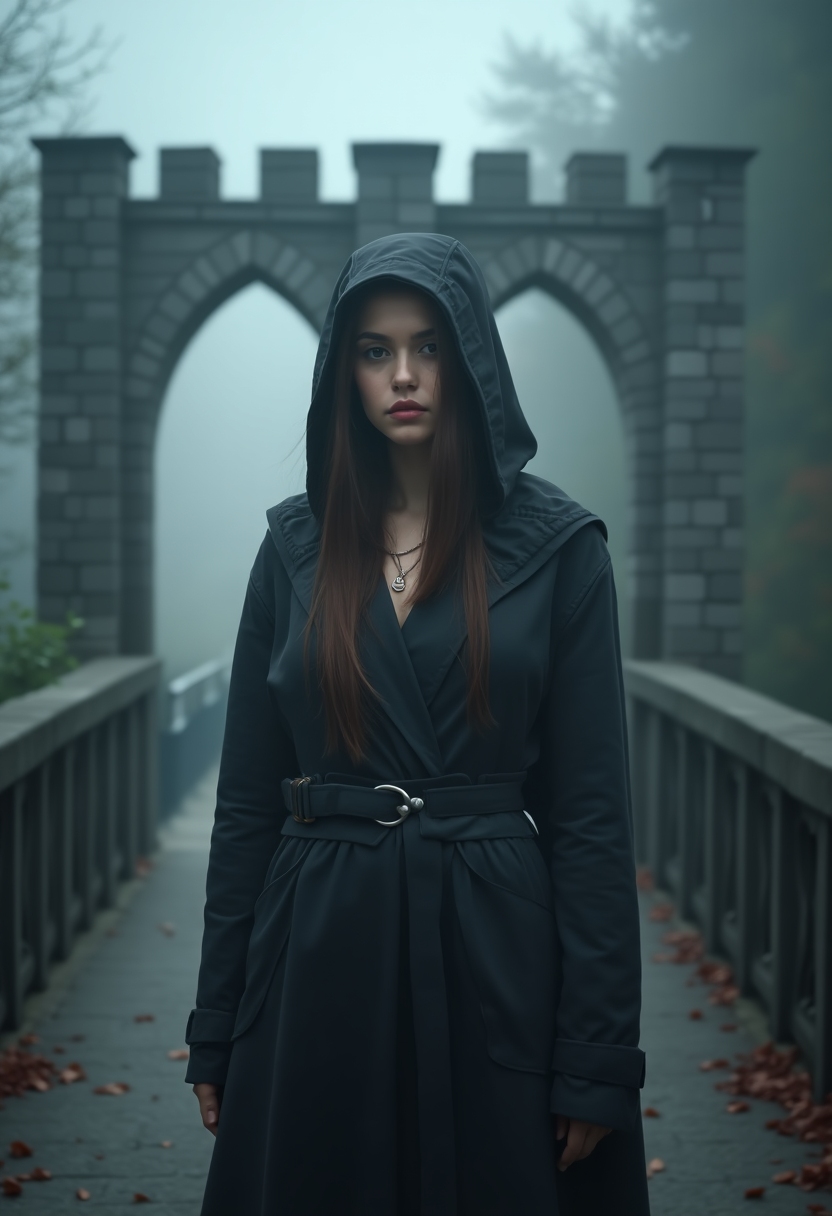 Женщина в плаще с капюшоном стоит на мосту с готическими арками, смотрит прямо в камеру, вокруг туман и магический свет