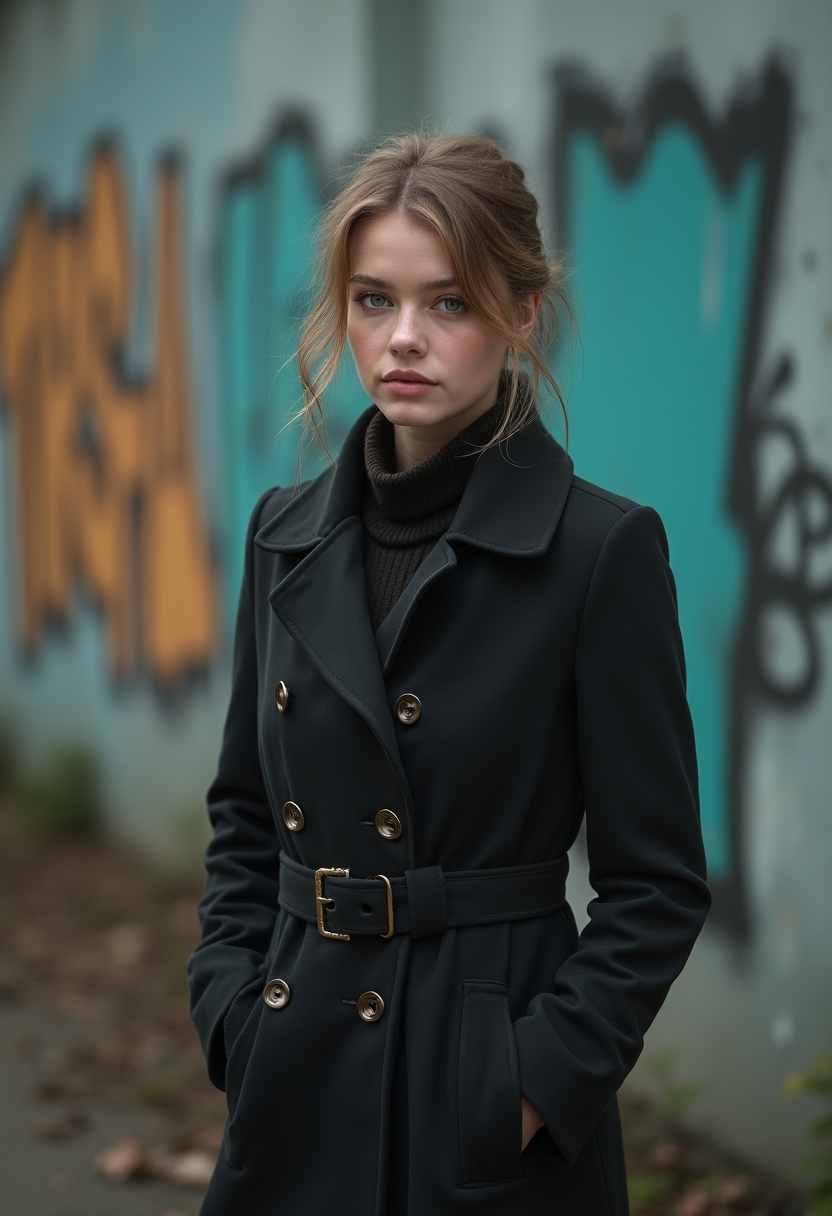 Женщина в плаще стоит на пустынной улице Припяти, смотрит прямо в камеру на фоне граффити на стене
