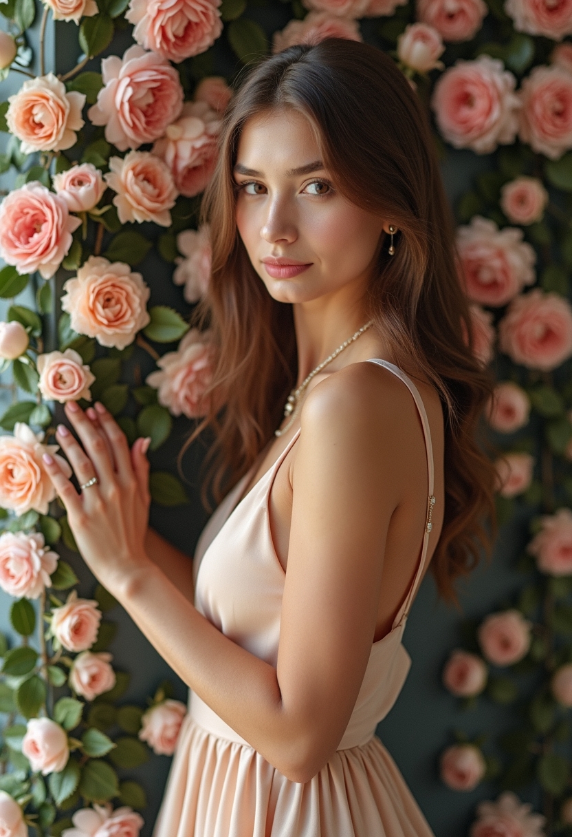 Примерить образ на себеЖенщина в платье цвета шампанского стоит у стены, полностью украшенной розами и пионами. Она слегка касается цветов рукой и смотрит вбок с задумчивым выражением лица. Освещение мягкое, акцент на её утончённости и изобилии цветов.