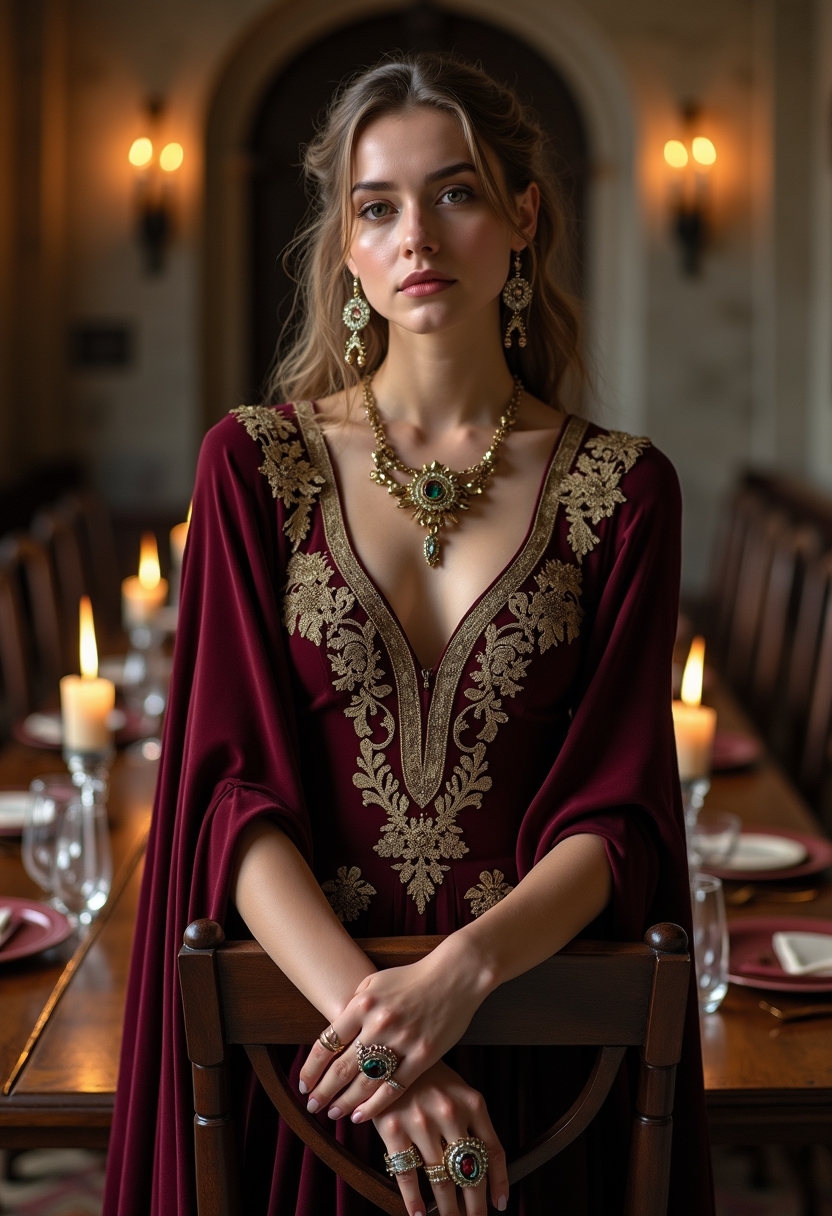 Женщина в платье цвета тёмного вина с золотой вышивкой и массивными кольцами с камнями стоит у огромного деревянного стола, украшенного серебряной посудой и свечами. Её руки сложены на спинке стула, а взгляд направлен прямо в камеру. Позади видны стены замка с готической архитектурой. Освещение тёплое, акцент на её украшениях.
