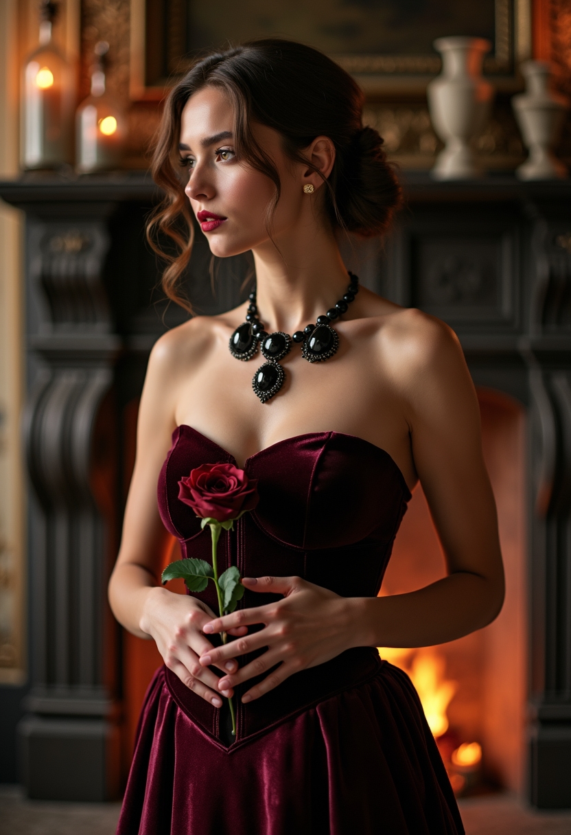 Женщина в платье глубокого винного цвета с бархатным корсетом и колье из чёрного оникса стоит у старинного камина с резными элементами. Она смотрит вбок, слегка подняв подбородок. В руках она держит розу тёмного оттенка. Позади виден огонь в камине, освещение тёплое, акцент на её утончённом лице и аксессуарах.