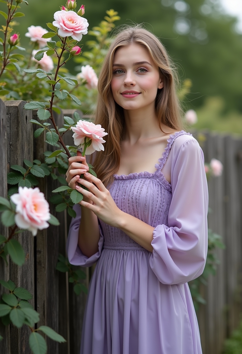 Женщина в платье лавандового оттенка с длинными рукавами стоит у деревянного забора, украшенного цветущими розами. Она держит в руках ветку с цветами и смотрит прямо в камеру с лёгкой улыбкой. Позади виден зелёный сад. Освещение мягкое, акцент на её нежности.