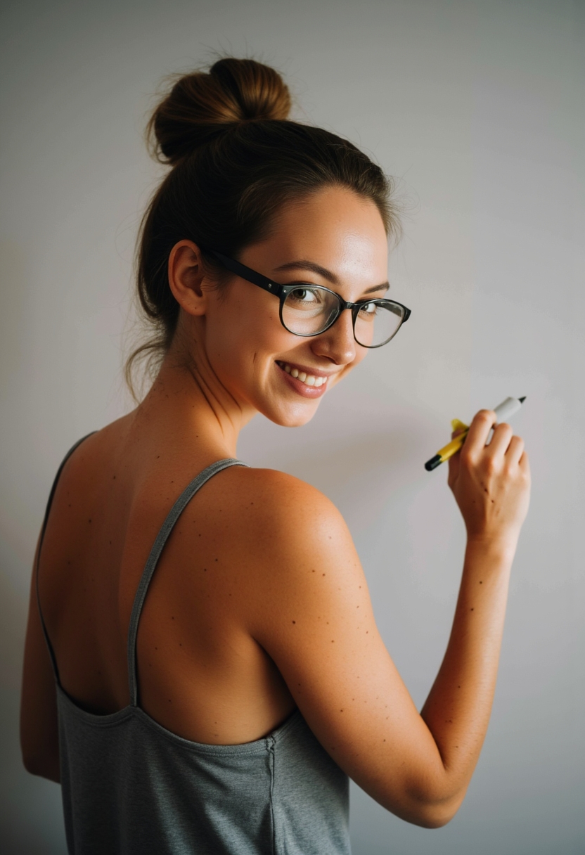 Женщина в платье миди и очках пишет на доске, стоя в профиль, затем поворачивается и смотрит в камеру. Волосы собраны в аккуратный пучок. Крупный план, акцент на живом процессе преподавания.