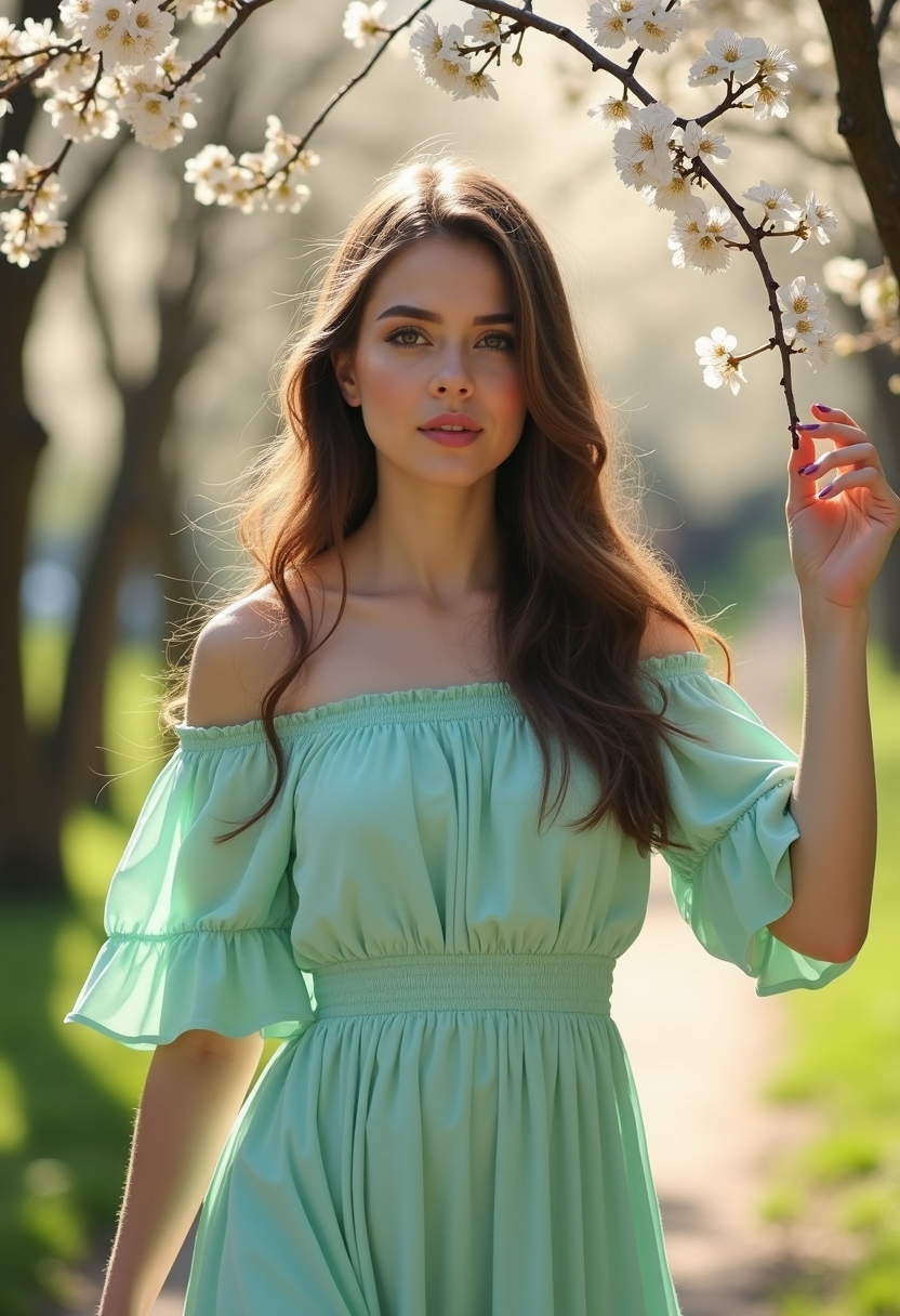 Женщина в платье мятного цвета с лёгкими рукавами идёт по тропинке среди цветущих деревьев. Её взгляд направлен вбок, а одна рука касается ветки с цветами. Позади видны солнечные лучи, пробивающиеся сквозь листву. Освещение естественное, акцент на свежести образа.