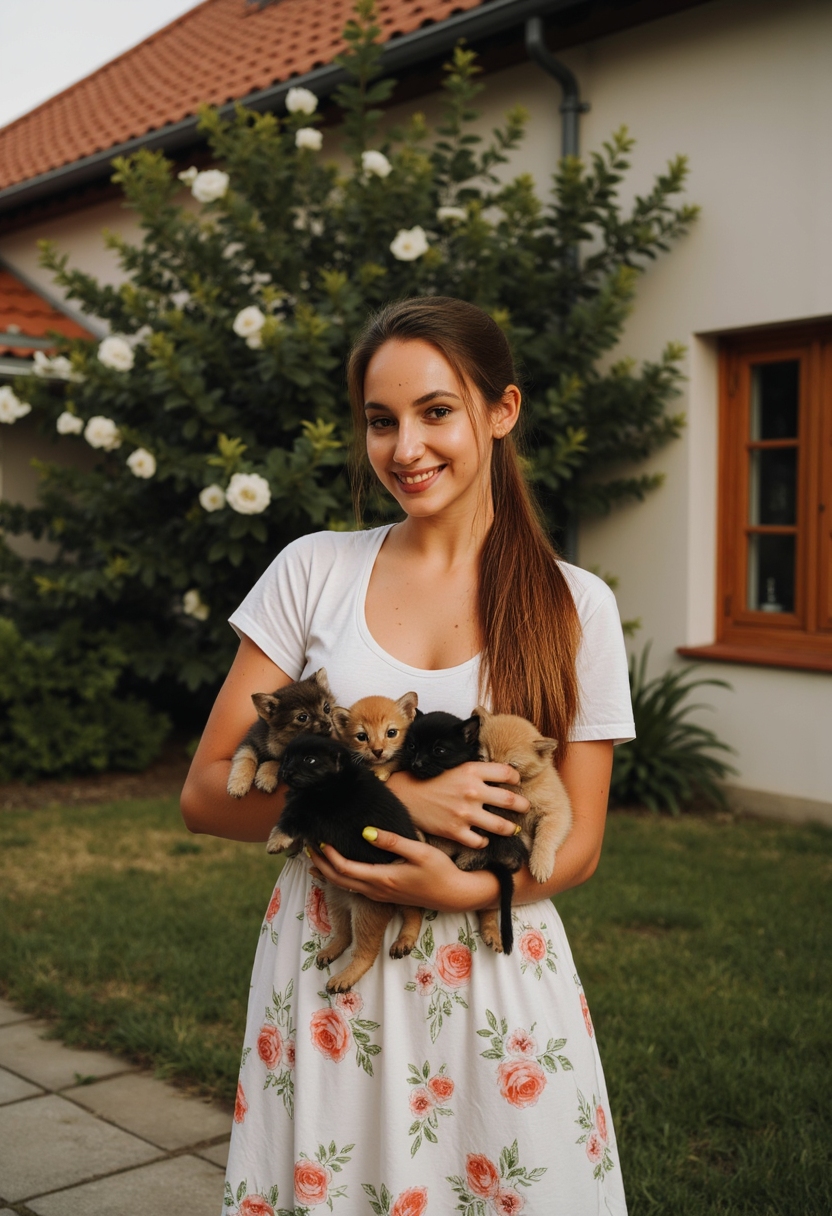 Женщина в платье с цветочным принтом держит в руках несколько щенков и котят. Фон — старинный дом с деревянными окнами и цветущими кустами.