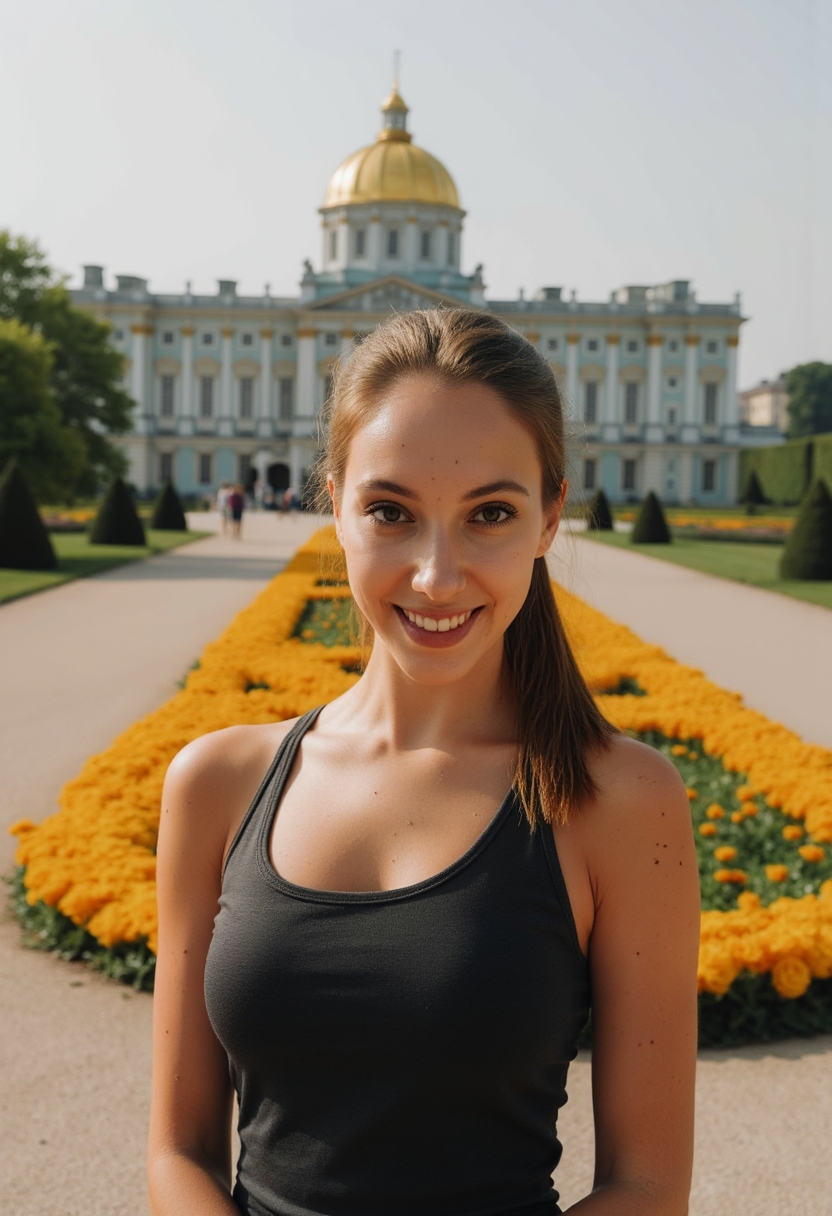 Женщина в платье стоит на фоне Екатерининского дворца, улыбаясь и глядя в камеру. Позади неё преобладает величественная архитектура дворца с его характерными голубыми и золотыми оттенками, а также ухоженный парк Царского Села с зелеными деревьями и яркими цветами. Солнечный свет освещает сцену, подчеркивая детали платья и создавая теплую атмосферу. Крупный план, в кадре акцент на лице и наряде женщины, окруженном красотой исторического пейзажа.
