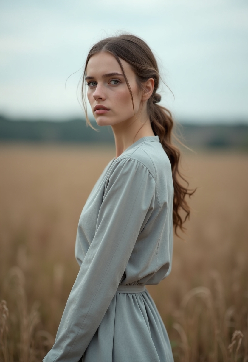 Женщина в платье светло-серого оттенка из плотной ткани стоит боком, глядя вдаль на фоне пустого поля. Её поза спокойна, а лаконичное пространство сливается в холодных оттенках, подчёркивая минимализм и сдержанность северного стиля. Крупный план.