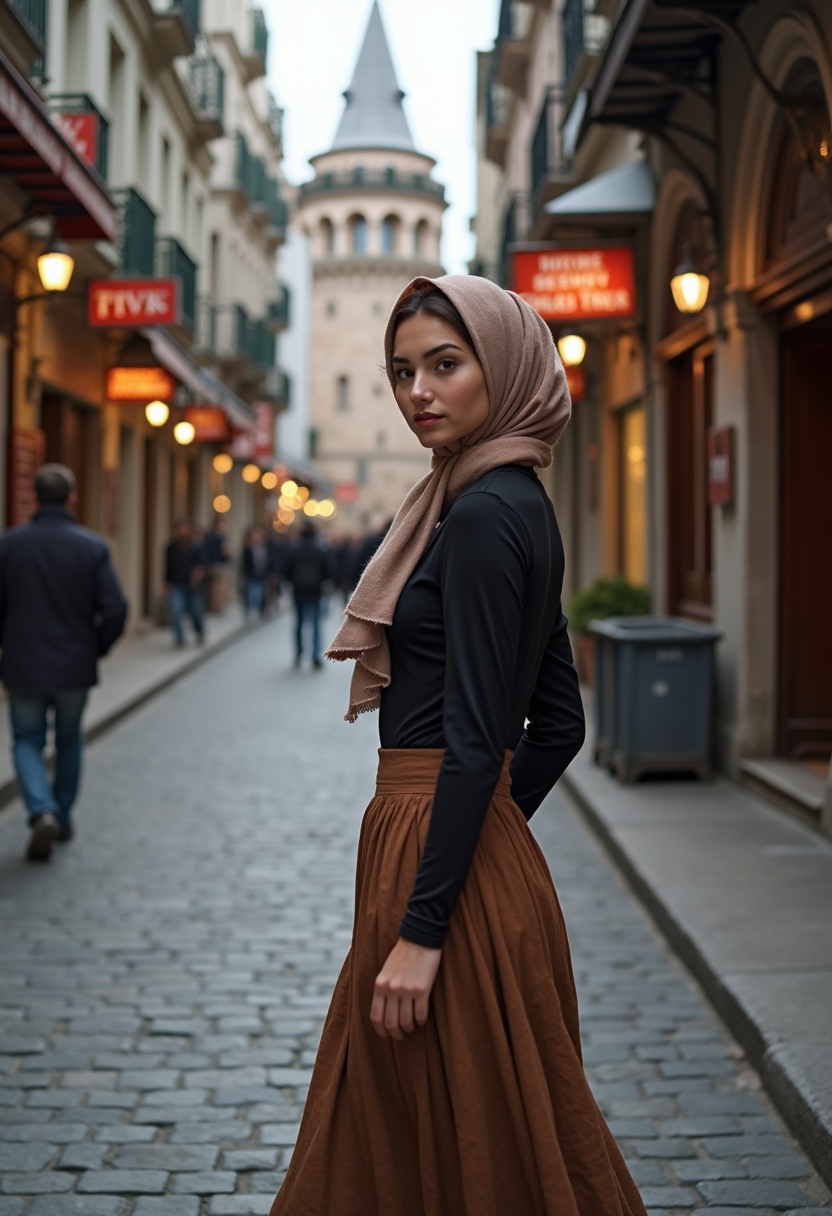 Женщина в платке и длинной юбке идёт по мощёной улице возле Галатской башни. Позади — старинные фонари и вывески. Она слегка поворачивается к камере. Крупный план, акцент на естественности и духе старого города.