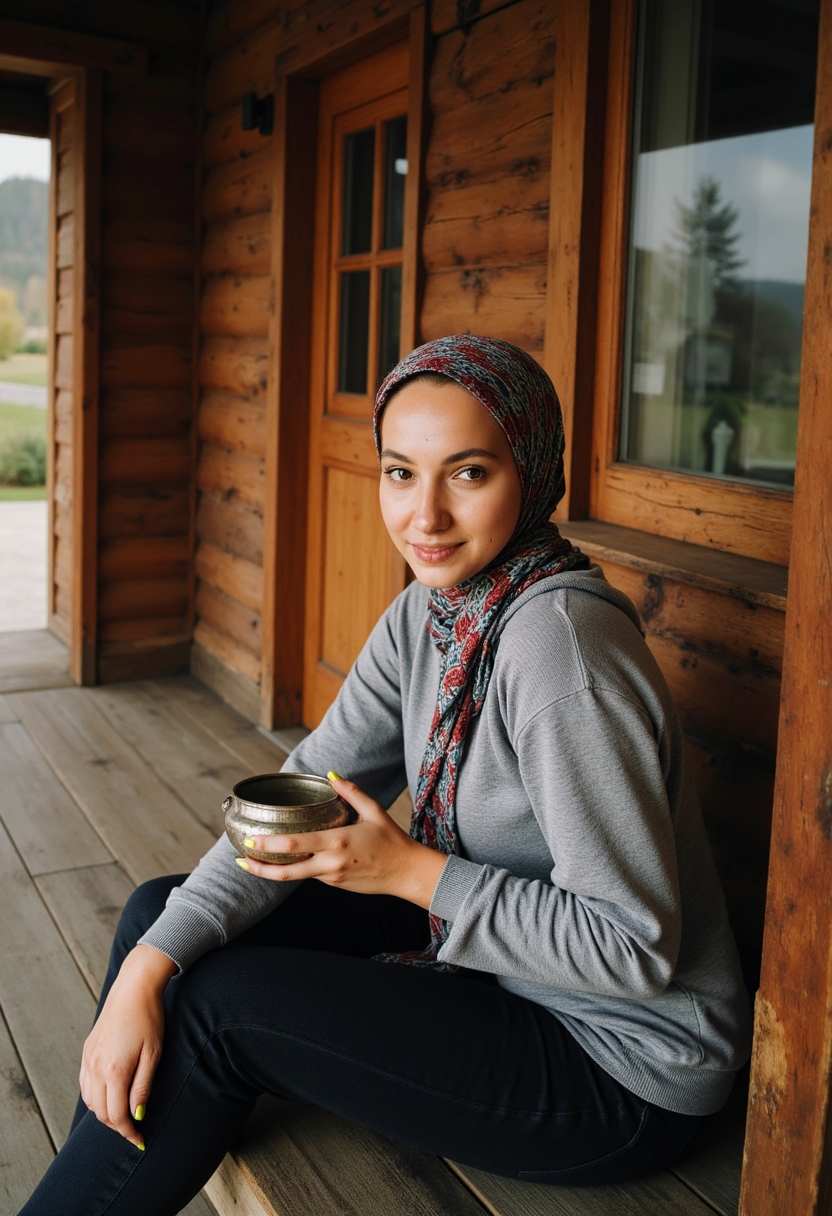 Женщина в платке с традиционным орнаментом сидит на лавочке у деревянного дома, держит самовар, смотрит прямо в камеру