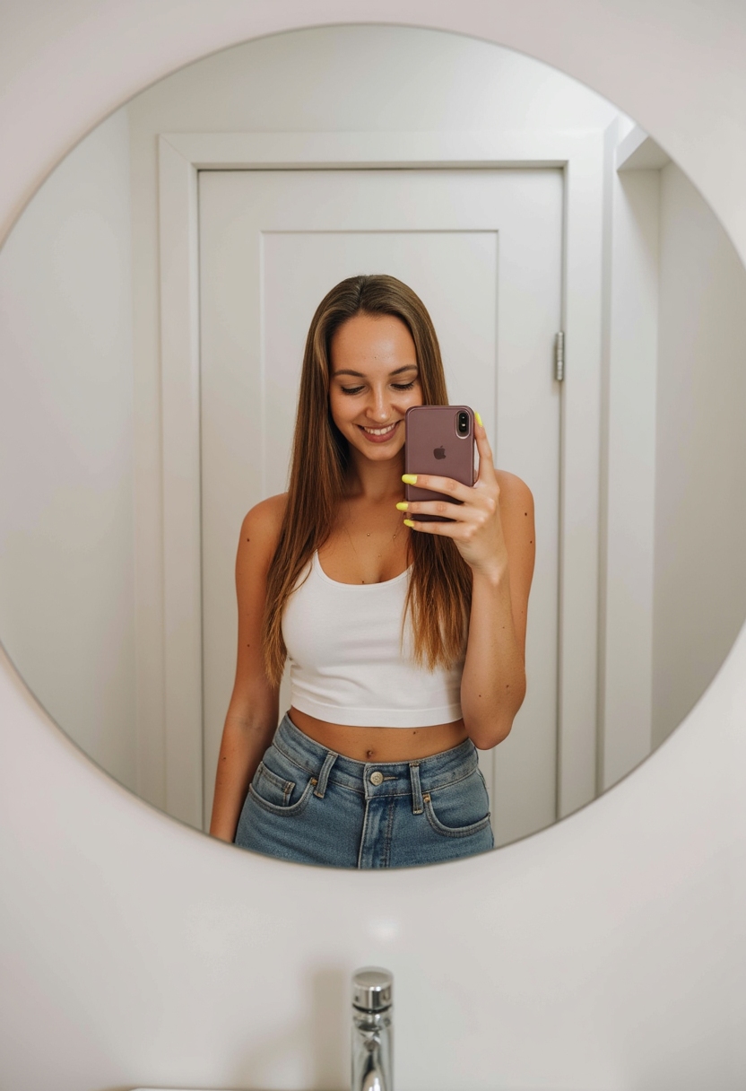 Женщина в повседневной одежде делает селфи в зеркале общественного туалета, вокруг минималистичный белый интерьер