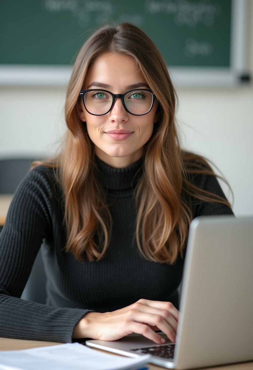 Женщина в повседневной одежде и очках сидит за ноутбуком в классе. Рядом — стопка методичек. Она смотрит в объектив спокойно и уверенно. Крупный план, акцент на современном и гибком образе преподавателя.