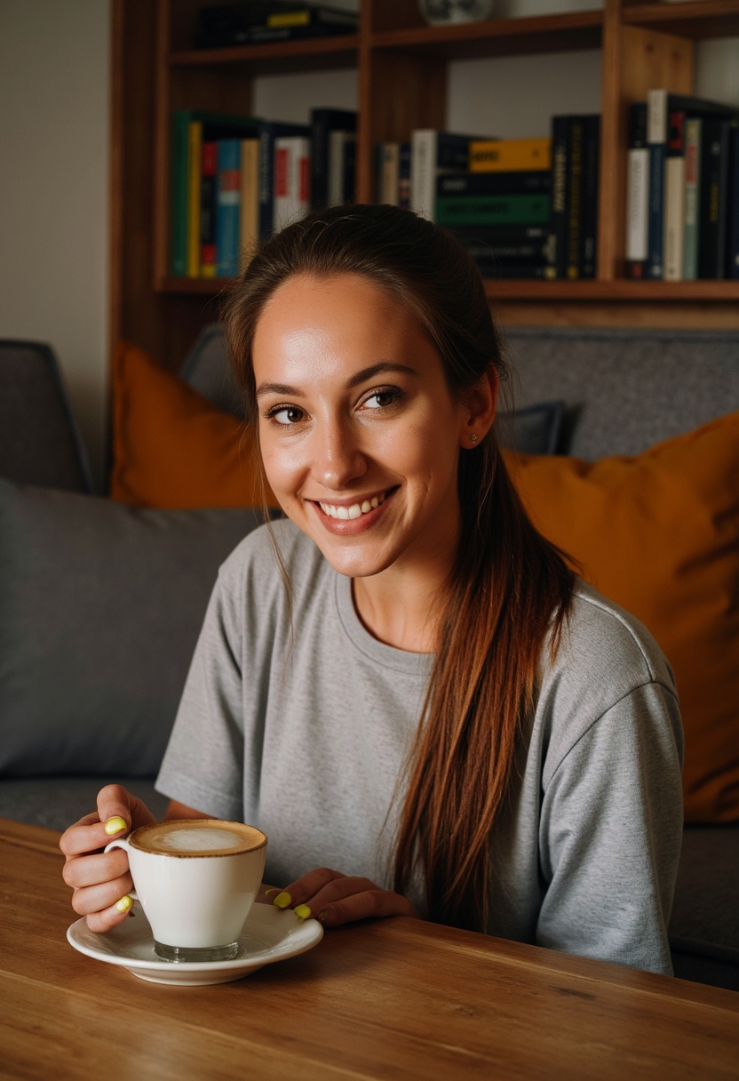 Женщина в повседневной одежде сидит в уютной кофейне с чашкой капучино в руках, улыбается в камеру, вокруг теплый интерьер с книжными полками.