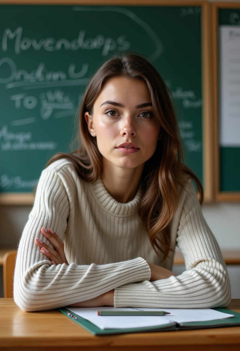 Женщина учительница сидит на краю парты в пустом классе, её руки сложены на коленях, взгляд направлен в объектив. Она одета в лёгкий свитер и юбку, макияж натуральный. Крупный план, передающий тепло и открытость.