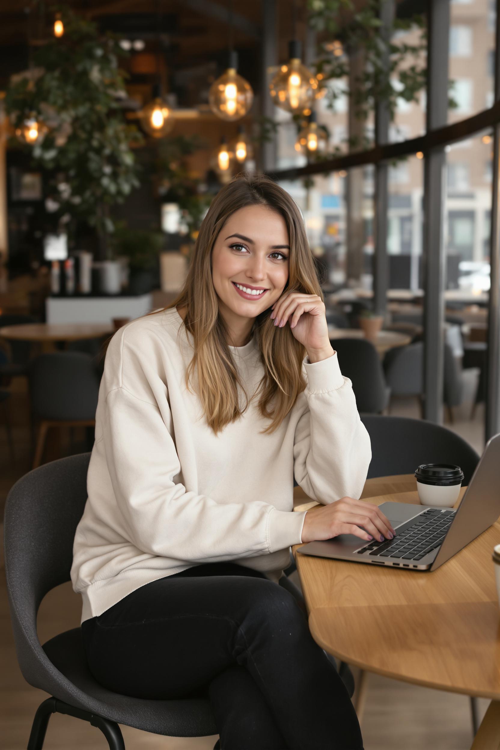 Женщина в стильной светлой блузке и чёрных брюках сидит на деревянном стуле у стены с винтажными фотографиями, на столе чашка мокко и маленькая ваза с цветами, она смотрит прямо в камеру с лёгкой загадочной улыбкой, кофейня наполнена мягким светом.