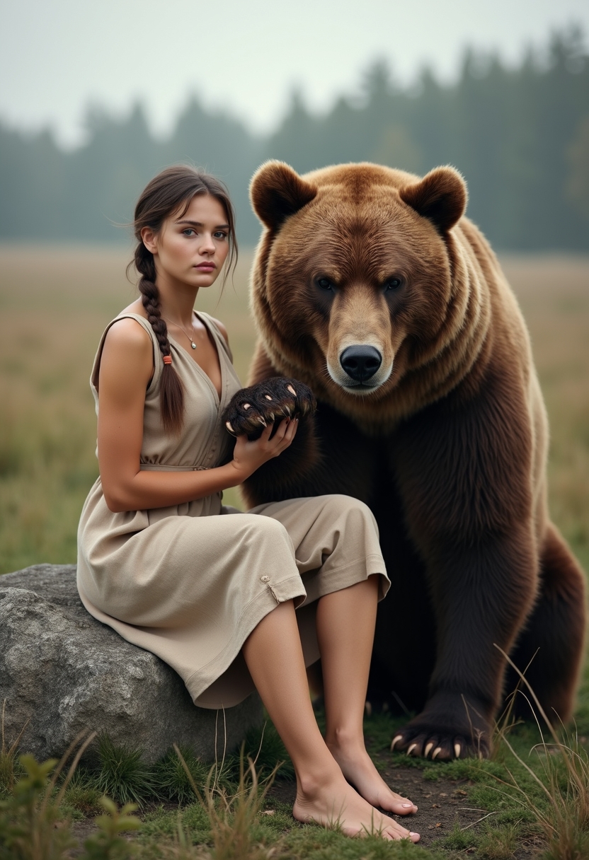Женщина в простом льняном платье землистого оттенка сидит на большом валуне рядом с медведем. Её босые ноги касаются травы, волосы собраны в косу. Она смотрит прямо в камеру, а её ладонь лежит на мощной лапе зверя. Позади раскинувшийся русский пейзаж — поле, берёзы, утренний туман. Освещение мягкое, подчёркивающее естественность момента.