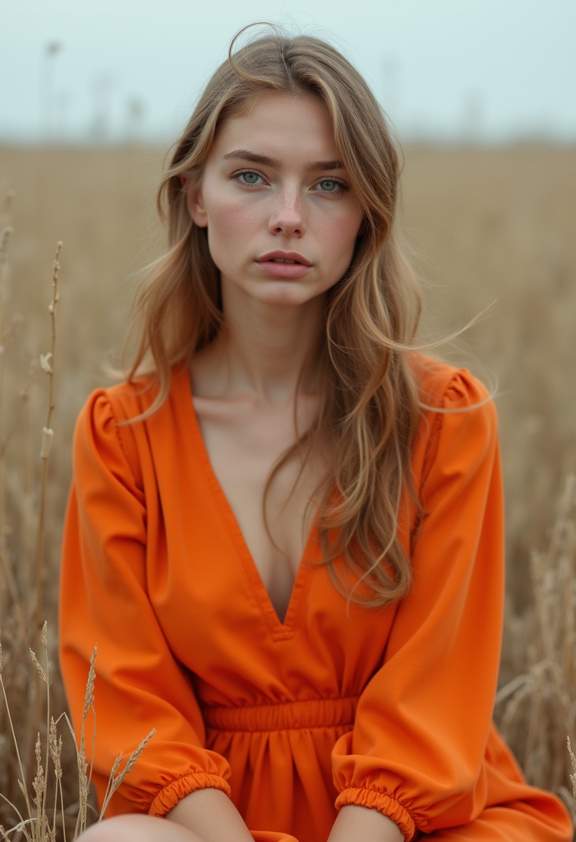 Женщина в простом платье сочного оранжевого цвета сидит в пустом поле, слегка согнув ноги. Взгляд направлен в камеру, её яркий наряд резко выделяется на фоне минималистичной пустоты в приглушённых серых и бежевых тонах. Крупный план.