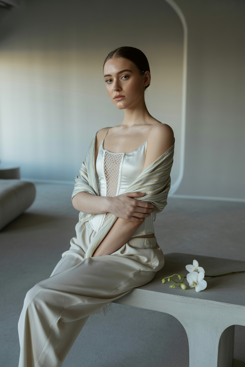 Женщина в просторной фотостудии с минималистичным белым интерьером, одета в белый сатиновый корсет с тонкими кружевными вставками, свободные кремовые брюки и лёгкий полупрозрачный палантин на плечах. Она полусидит на низкой скамье, руки скрещены на груди, крупный план, внимательно смотрит в камеру, вокруг мягкое утреннее освещение.