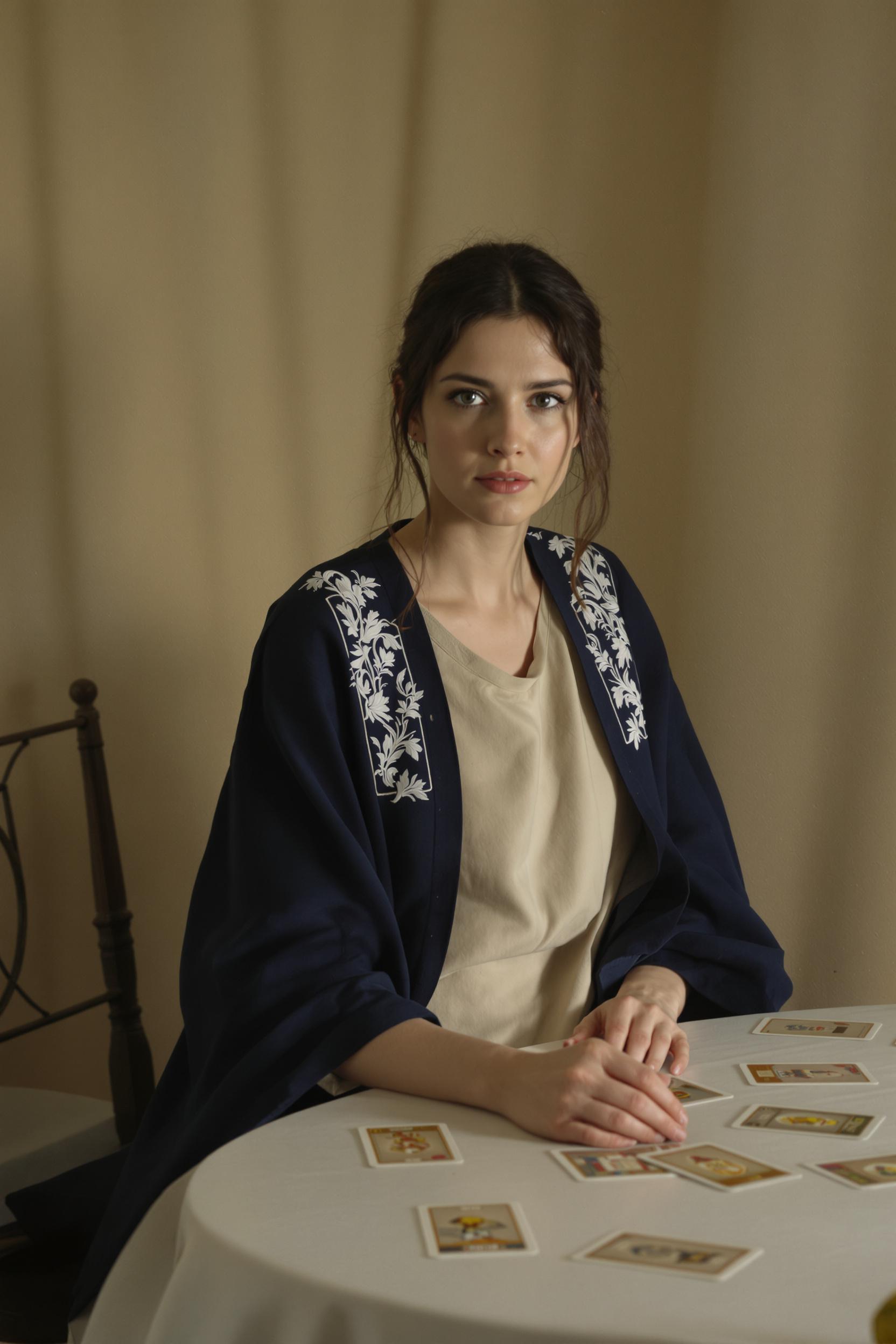 Женщина в просторной песочно-серой тунике свободного силуэта и тонкой темно-синей мантии с легкой вышивкой на плечах сидит за круглым светлым столом. Перед ней разложены карты Таро, остальной антураж минимален. Она смотрит прямо в камеру, мистическая атмосфера.
