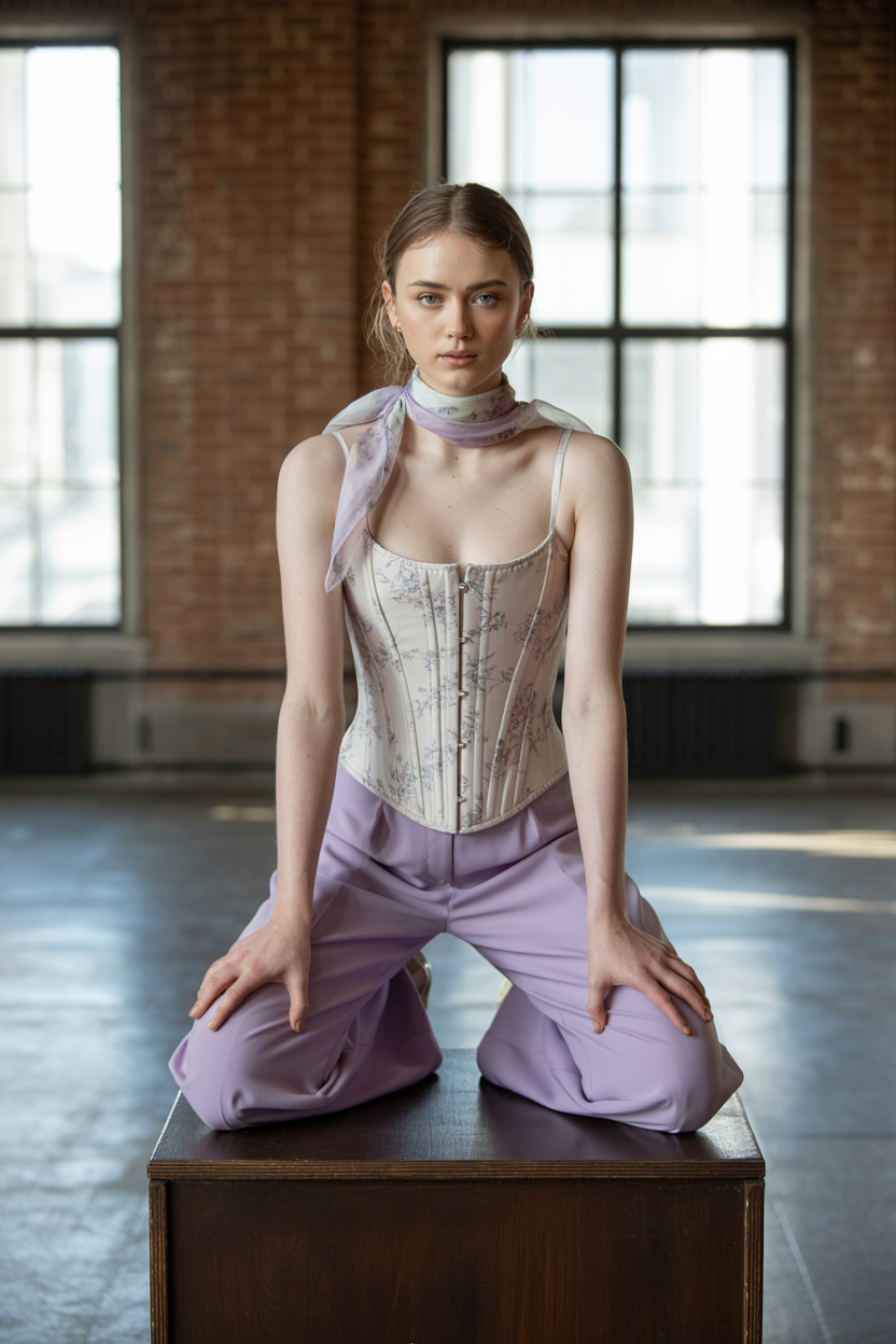 Женщина в просторной студии с кирпичными стенами и большими окнами, одета в светлый корсет с цветочным принтом, струящиеся лавандовые брюки и прозрачный шарф на шее. Она стоит на одном колене на подиуме, упираясь обеими руками в поверхность, смотрит прямо в камеру, вокруг мягкий дневной свет.