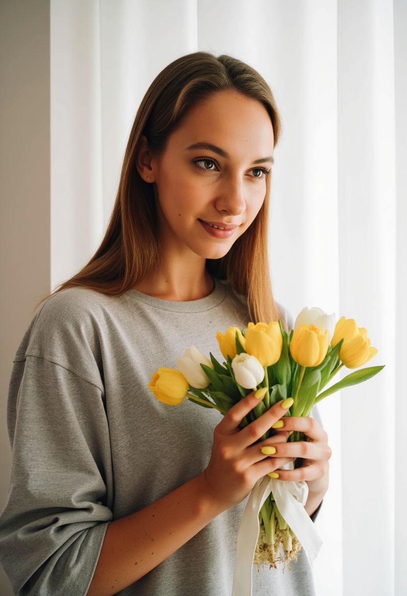 Женщина в просторной светлой комнате стоит у окна, в её руках нежный букет тюльпанов, перевязанный атласной лентой. Она смотрит в камеру с задумчивой улыбкой, её пальцы мягко касаются стеблей. Позади воздушные белые шторы, через которые проникает дневной свет. Ближний план, создающий атмосферу уюта и нежности.