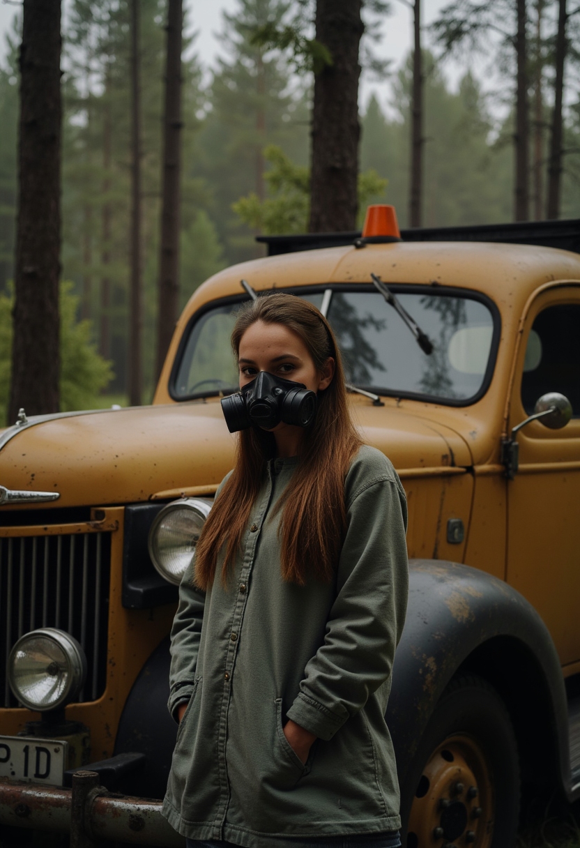 Женщина в противогазе стоит у старого советского грузовика, прямо смотрит в камеру, вокруг густой лес