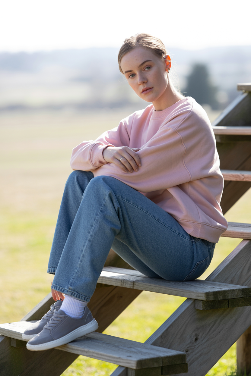 Женщина в прямых джинсах средней голубизны и нежно-розовом хлопковом свитшоте с широкими рукавами. На ней серые минималистичные кеды. Она сидит на деревянной лестнице ранчо, одну ногу согнула и поставила на ступеньку, руками обняла колено, смотрит прямо в камеру. Крупный план, пастельный уличный фон.