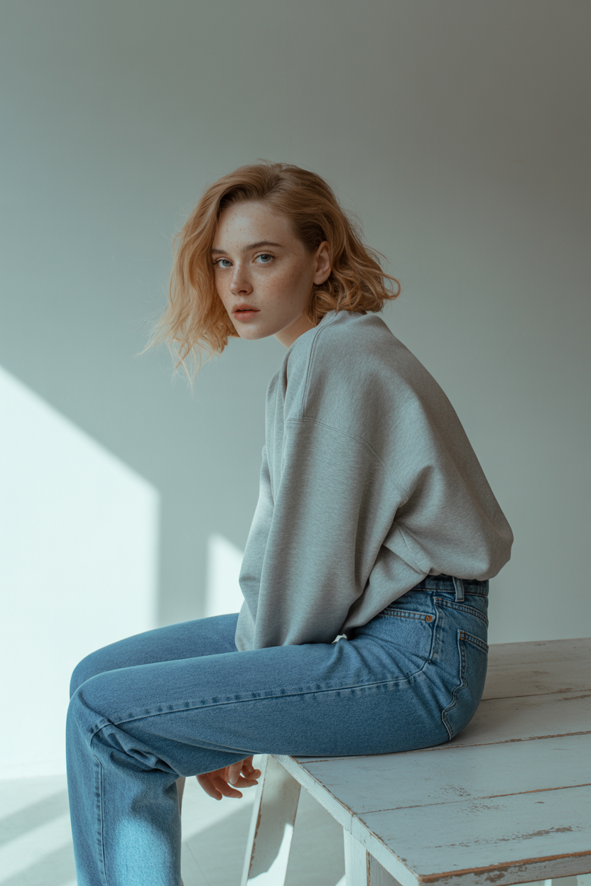 Женщина в прямых джинсах средней синевы с высокой талией и базовом светлом оверсайз свитшоте, на ногах минималистичные белые кеды. Она сидит боком на краю светлого деревянного стола, обе руки свободно свесила вниз, ноги скрещены. Выразительный взгляд прямо в камеру, крупный план, студийный минимализм.