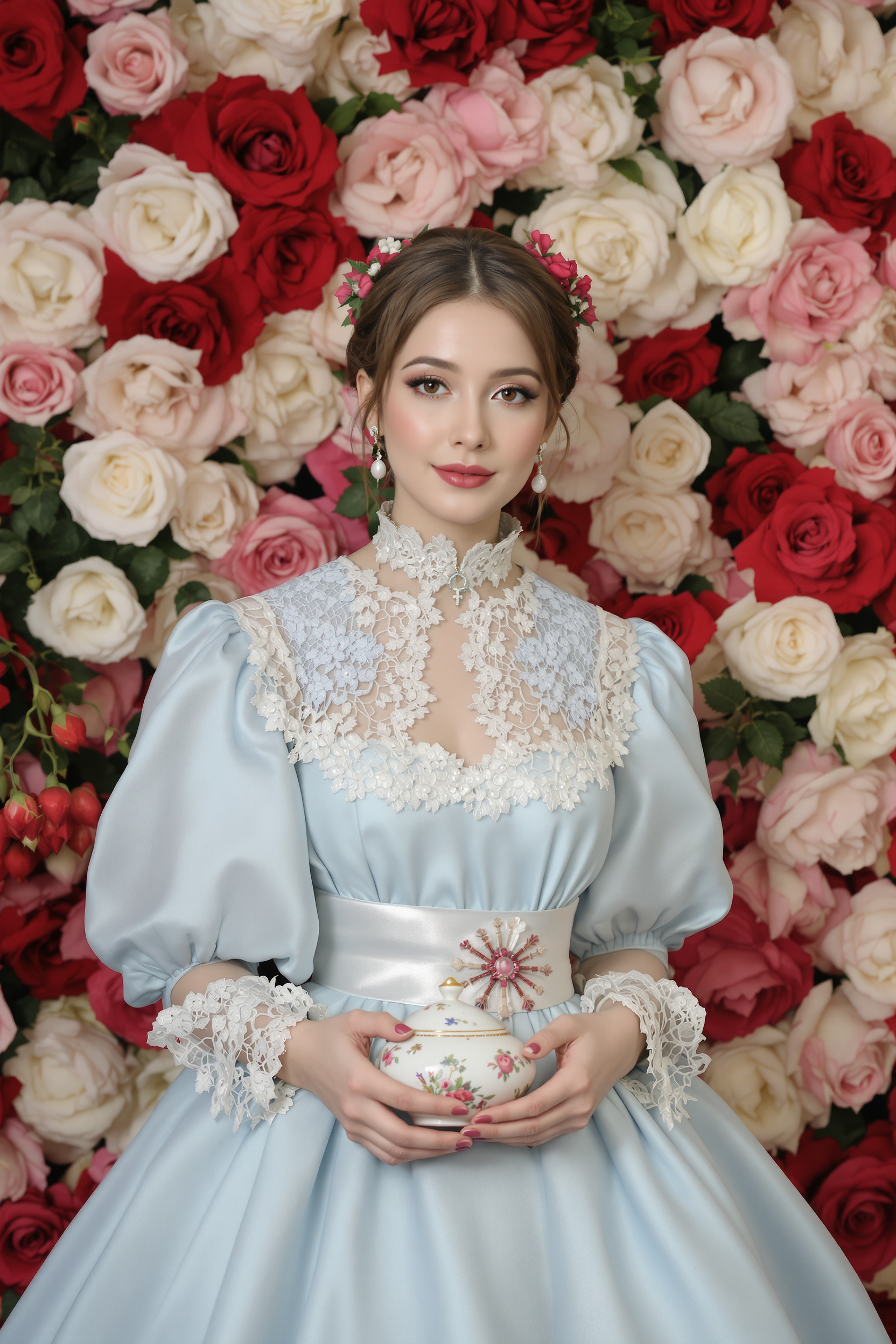 Женщина в пышном бледно-голубом платье с ажурными манжетами и белым кружевным воротником, на талии атласный пояс с подвеской-ключом, в руках фарфоровый чайник, на фоне гигантских красных и белых роз, средний план, взгляд прямо в камеру, атмосфера сказки.