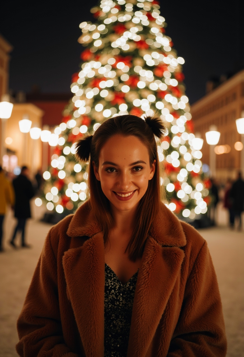 Женщина в пышном платье с меховой накидкой стоит перед нарядной новогодней ёлкой на Красной площади, вокруг вечерние огни и гирлянды