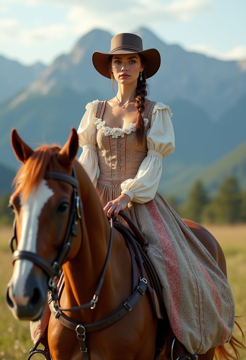 Женщина в романтичном платье с шляпой сидит верхом на лошади, за спиной видны горы и пастбище