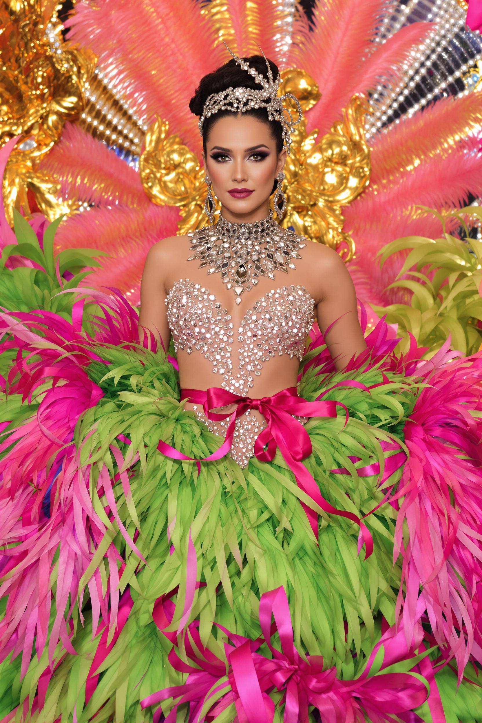 Женщина в роскошном костюме с блестящим топом из серебристых пайеток, объемной юбкой из зелёных и розовых перьев, атласные ленты, массивное ожерелье, длинные перчатки, на фоне фееричного танцевального парада, средний план, взгляд в камеру.