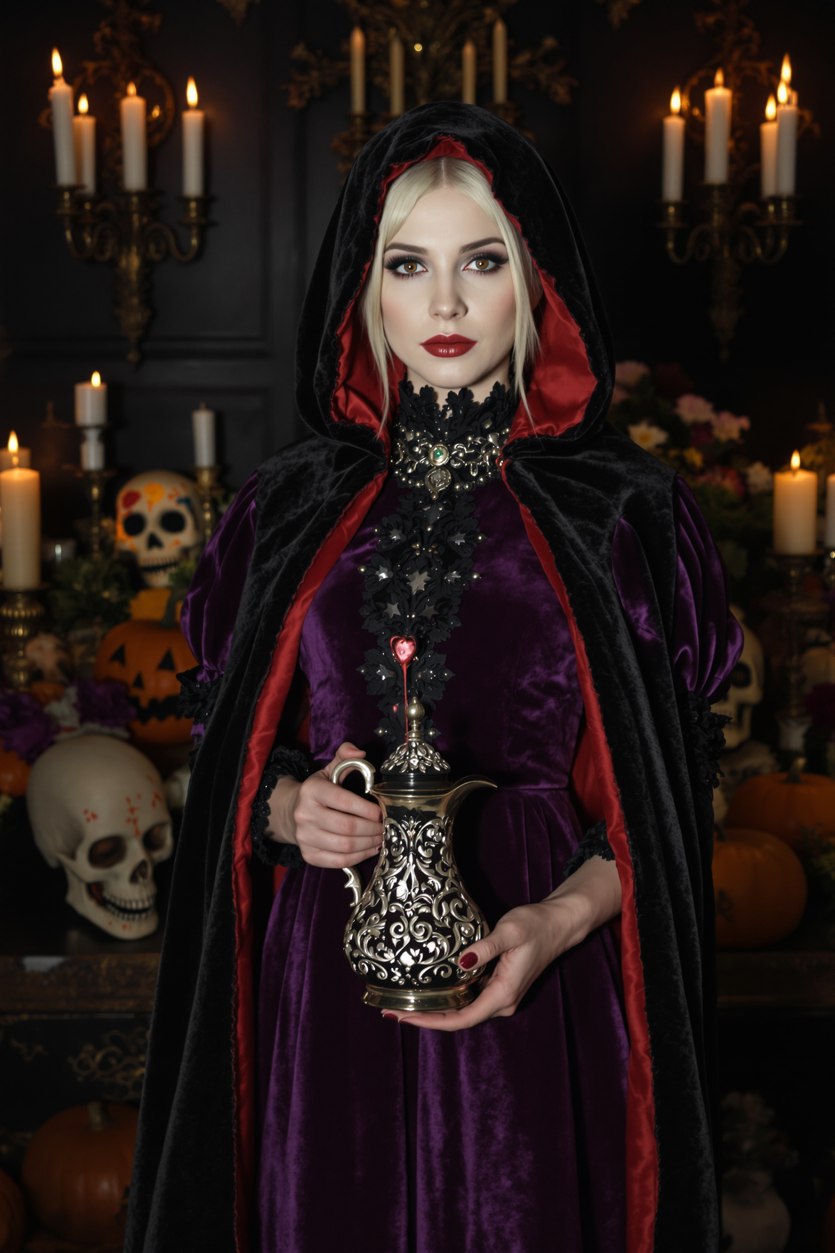 Женщина в роскошном пурпурном бархатном платье с пышными рукавами и кружевным воротником, поверх — длинный черный плащ с алым подбоем. Стоит в средний план, внимательно смотрит в камеру. В руках держит резной серебряный кувшин с кровью, на фоне — свечи, черепа и резные тыквы, вечерняя таинственная атмосфера.